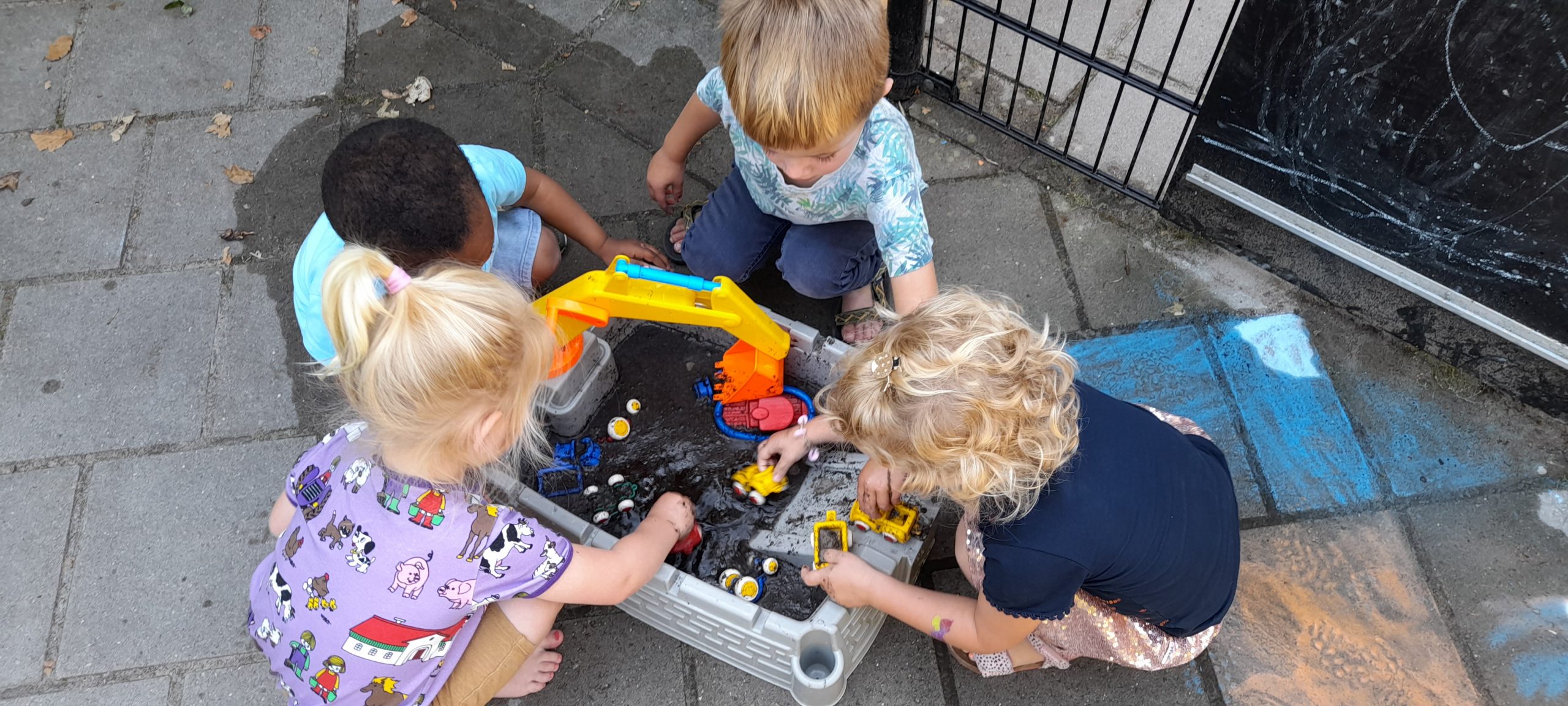 Woensdag 29 juni was de landelijke “Modderdag” en bij de Buurtkabouters  is ook volop met zand en water gespeeld. Bij ons verfbord kon met de handen een moddertekening gemaakt worden, de varkens werden flink door de modder gerold, de vrachtauto’s konden moeilijk door de modder rijden en vooral het zoeken naar de schat was favoriet. In een bak zaten schelpen in de modder verstopt. Steeds weer werden deze er allemaal uit gehaald en er weer ingedaan, zodat opnieuw gezocht kon worden. We hadden een emmer met schoon water klaar staan en de peuters wasten zelf hun armen schoon om daarnaar weer gelijk in de modder te graaien naar de schelpen.