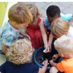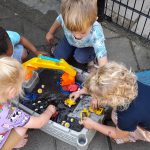 Met dit lekkere weer spelen we veel buiten. Op ons plein zijn een aantal regenputten. Sommige peuters ontdekken dat ze tussen de spijlen door speelgoed, blaadjes of steentjes erin kunnen gooien. Maar dit is natuurlijk niet de bedoeling. Dus als de tuinmannen komen om de putten te legen, gaan we met z’n allen kijken hoe ze dit doen. De put is beveiligd en wordt met speciaal gereedschap open gemaakt, wat al interessant is. En dan blijkt er van alles in te liggen. Een mooie gelegenheid om uit te leggen waarom ze er niets in mogen gooien!