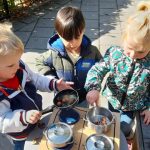 Er wordt ook veel buiten gespeeld. Daar hadden we al een keukenblok. En nu hebben we ook een kookplaat erbij.  Er kan nu buiten echt gekookt worden. De peuters willen graag allemaal tegelijk bij de keuken spelen, dus soms moet je even op je beurt wachten. Er zijn al veel bladeren gevallen en ook wat noten. Deze worden opgezocht en gebruikt om mee te koken. Roeren maar!