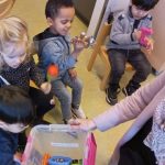 Regelmatig gaan we naar het speellokaal. Vrij spel of met diverse gymmaterialen in de weer. Deze keer hebben we met de pittenzakken en gekleurde sjaaltjes allerlei bewegingen gemaakt. Allereerst gingen we voelen aan de pittenzakken, horen welk geluid ze maken en hoe ze ruiken. Wat kunnen we er allemaal mee? Op je hoofd, je schouder, je arm, je hand en zo naar beneden tussen de knieën. Kun je er mee lopen? Ze lijken wel waggelende pinguïns.  Op je voet en dan op 1 been staan, nu zijn ze flamingo’s. Met de sjaaltjes kun je zwaaien en draaien en omhoog en omlaag en zelfs in de lucht gooien. De peuters komen zelf met allerlei ideeën en die doen we met z’n allen. Wat een plezier hebben ze.
