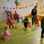En dan is het echte feest. Alle peuters zijn uitgenodigd en het is een gezellige drukte. Eerst wordt er op de groep een muziekinstrument geknutseld. Een wc-rolletje mogen de peuters versieren met stickers en dan gaat er rijst in en een mooi lintje eraan. Hiermee kunnen ze zelf muziek maken. Daarna zijn we met z’n allen naar het speellokaal gegaan. Daar is alles versierd en er zijn ballonnen en serpentines en muziek. De disco gaat aan en de peuters kunnen lekker dansen en bewegen op de liedjes. Wat gezellig. En tot slot hebben we op de groep allemaal gesmikkeld van patat met een knakworst. De juffen zijn verwend met een mooi cadeau en hebben, net als de peuters, genoten van het feest. Dank aan de oudercommissie die dit georganiseerd heeft.