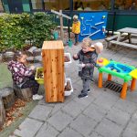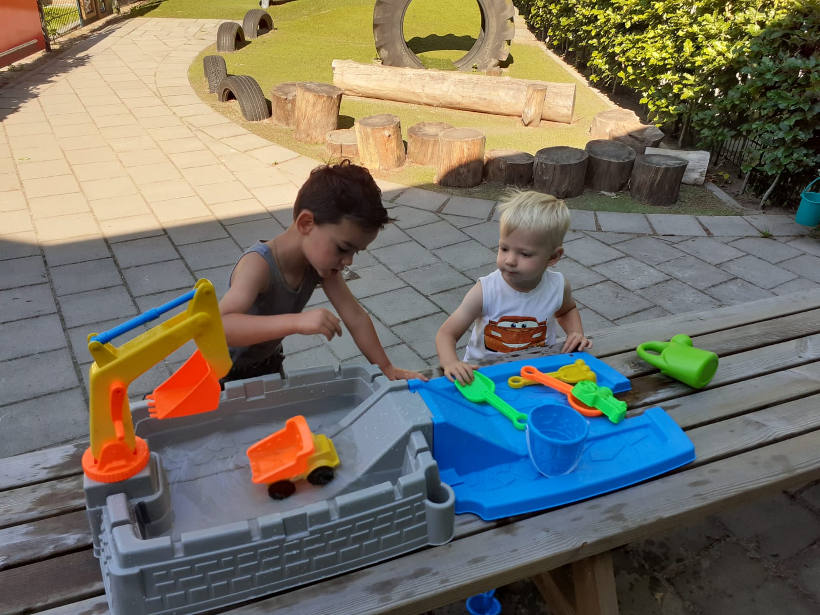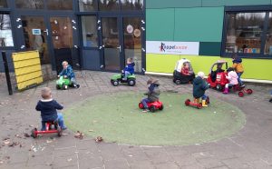 Het is goed te merken dat de peuters het gemist hebben om bij ons te spelen. Zowel op de groep als buiten. Het fietsen en autorijden is altijd erg gewild, daar hebben we dan ook genoeg materiaal van. Maar ook de glijbaan, het tekenbord, de boomstronken en ander materiaal wordt weer herontdekt en gebruikt.