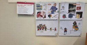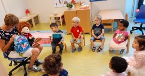 Zoals vaak aan het begin van een nieuw speeljaar starten er veel nieuwe kinderen. Zij moeten natuurlijk even wennen. Daarom beginnen we met het thema Welkom. Hoe ziet een ochtend op de peuterspeelzaal er uit, wat doen we allemaal en wat neem je mee in je tasje? We praten er veel over en laten het zien aan de hand van de dagritmekaarten.  De peuters maken kennis met elkaar en ook met de nieuwe vrijwilliger, die ons elke week op de dinsdag komt helpen.
