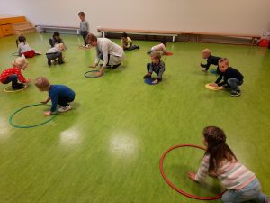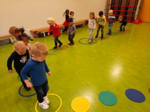 Dit keer is het een beweegspel. Door te vertellen dat het hier geregend heeft en er daarom allemaal regenplassen liggen, stimuleren we de fantasie van de peuters en zijn ze gemotiveerd om mee te doen. De hoepels liggen verspreid door het lokaal en stellen de regenplassen voor. Iedere peuter krijgt zijn eigen gekleurde hoepel om in te gaan staan.
