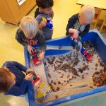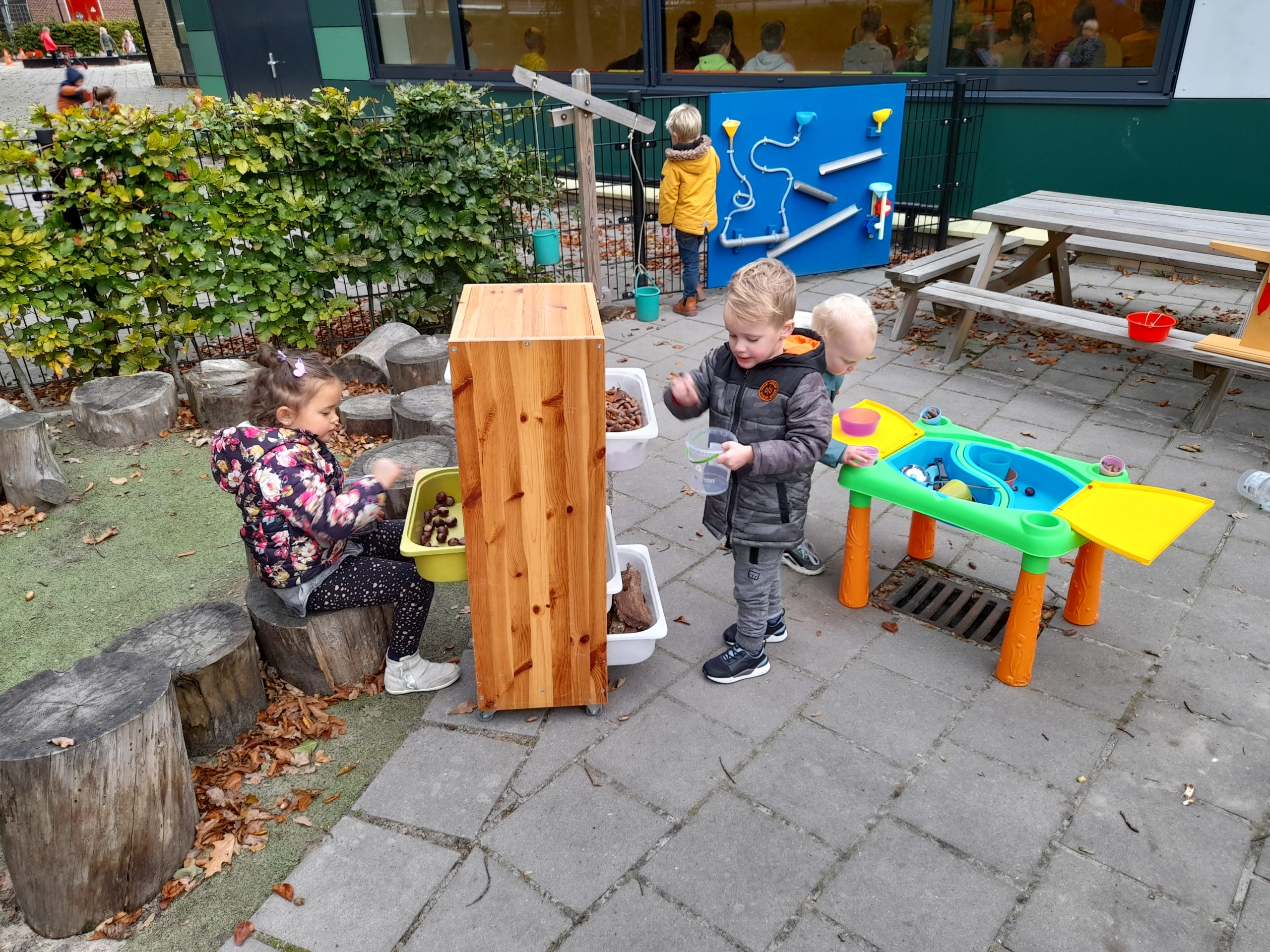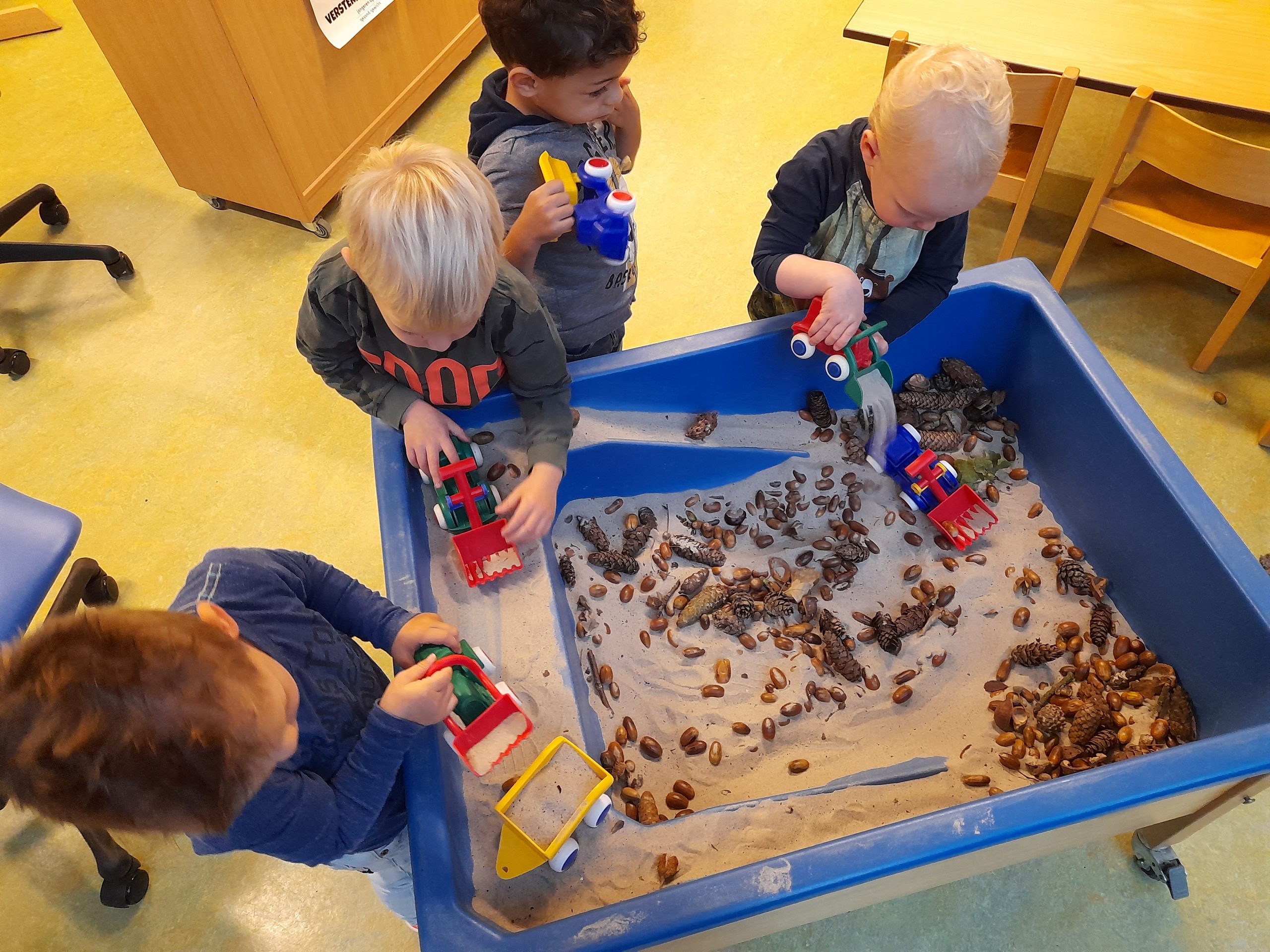 Natuurlijk wordt er daarna volop gespeeld met de herfstspullen. Op de groep wordt de zand/watertafel gevuld en kunnen ze met graafmachines de noten opscheppen en in de kiepwagens doen, daarna er mee rijden. Buiten wordt ook de tafel gevuld en met potten, pannen en lepels wordt er heerlijk gekookt met alle noten en bladeren. Ook kunnen de noten gesorteerd worden in de goede bakken.