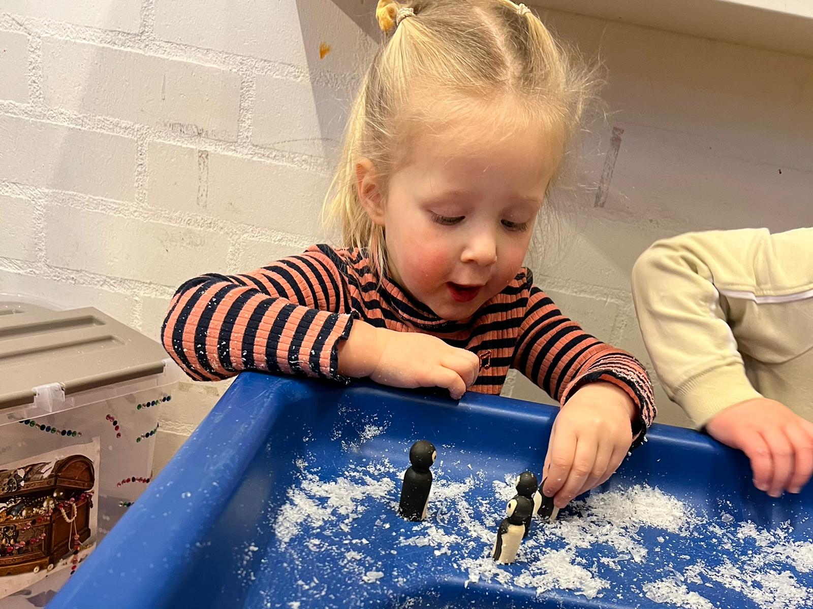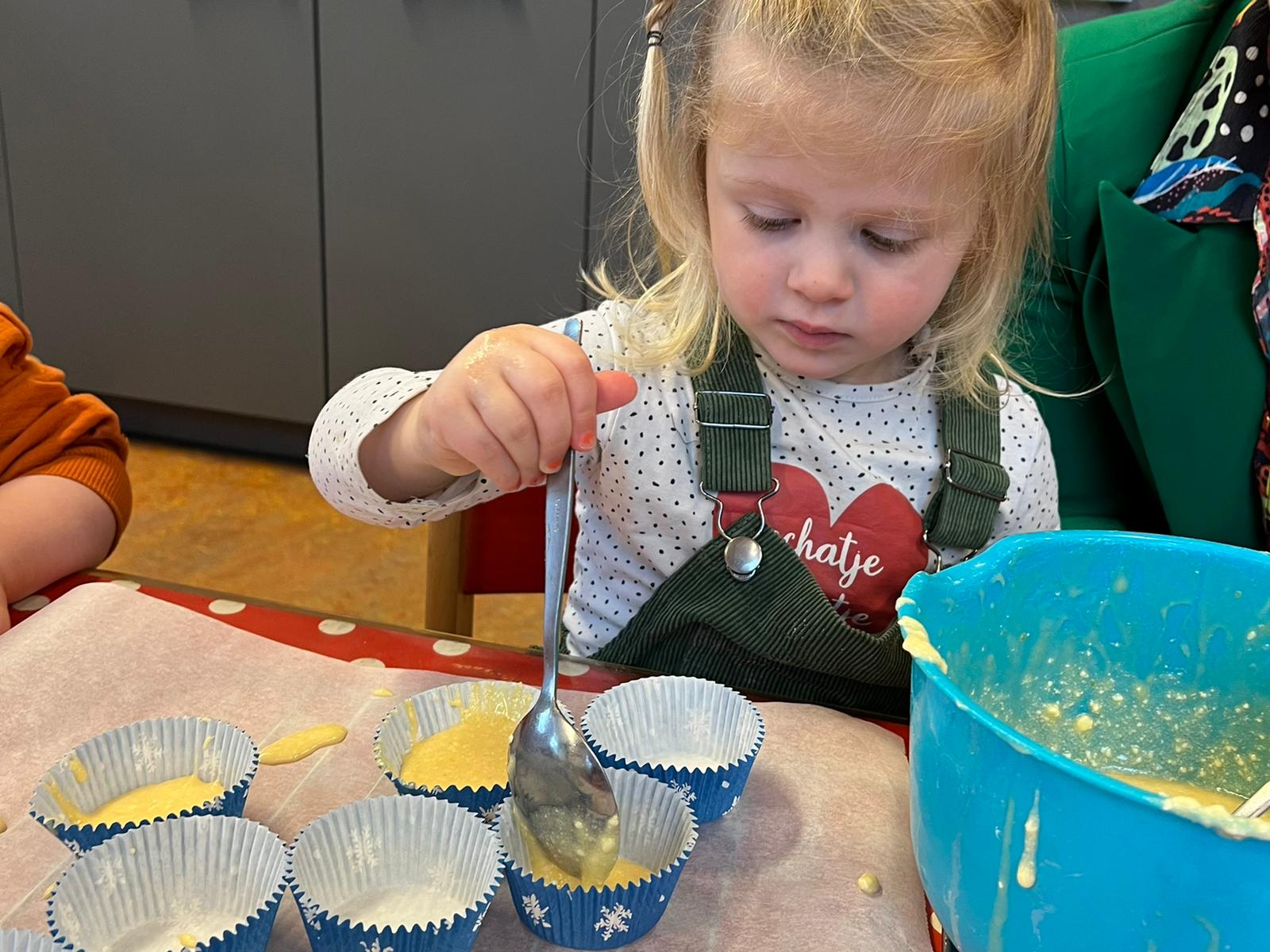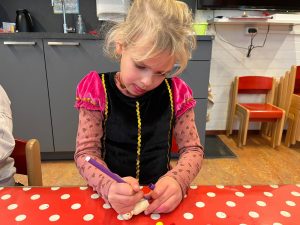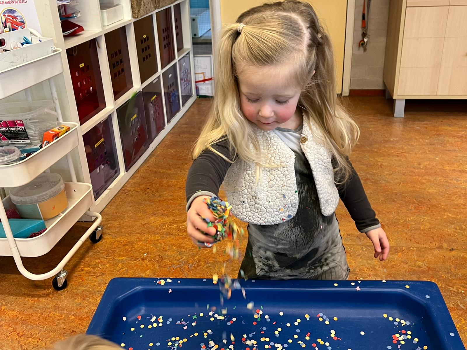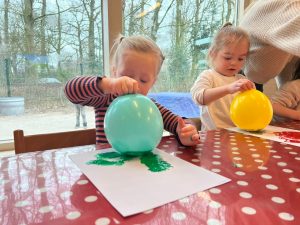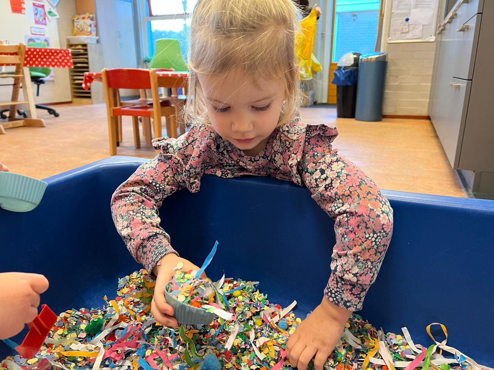 Het recente thema dat volgens de Startblokken-methode behandeld wordt, is ‘Wij vieren feest’. Nina vertelt dat de ruimtes met hulp van de kinderen versierd worden en dat er samen taartjes gebakken worden. “We vertellen wat feest is, en hebben een thematafel ingericht. In de huishoek liggen materialen die passen bij het vieren van feest. Kinderen kunnen helpen met versieren en kunnen het feestje ook echt spelen. Zo zijn er muziekinstrumenten, feestversiering en materialen om zelf taartjes en cakejes te bakken. Ook kunnen de kinderen experimenteren met ongevormde materialen. Zo staat er nu een lichtbak met gekleurde speelrijst op de groep en een zandtafel. In de zandtafel kunnen uiteindelijk ook weer materialen worden toegevoegd zodat er taartjes kunnen worden gemaakt.”