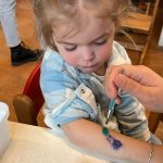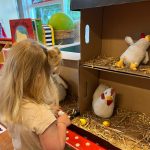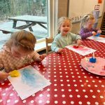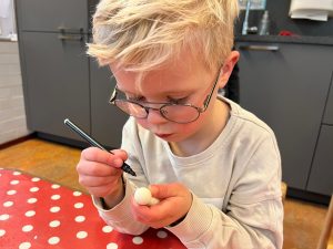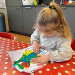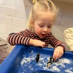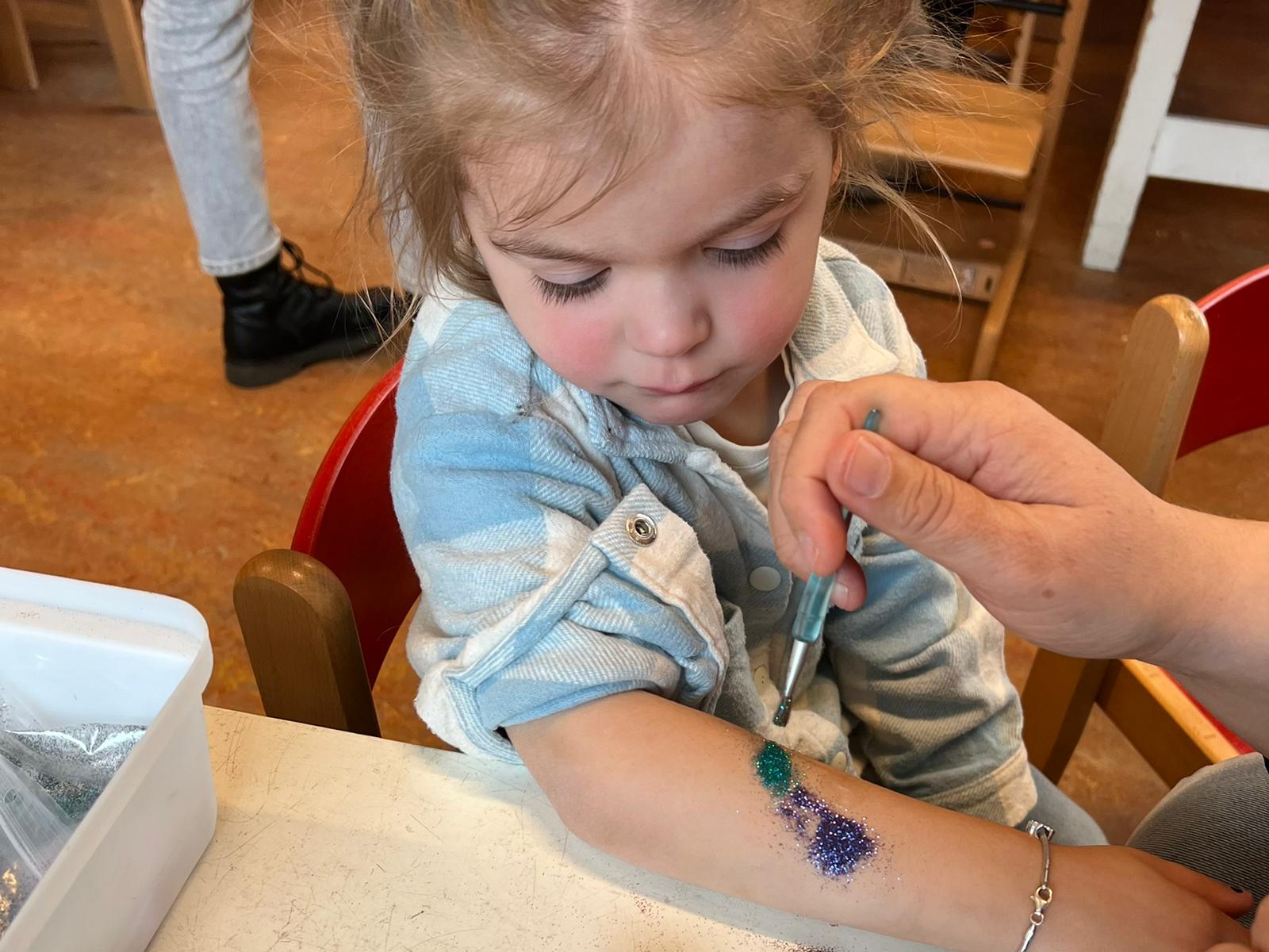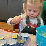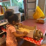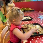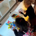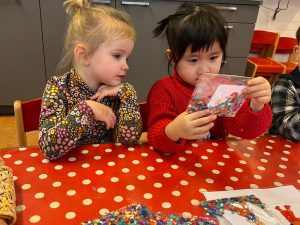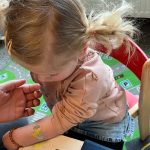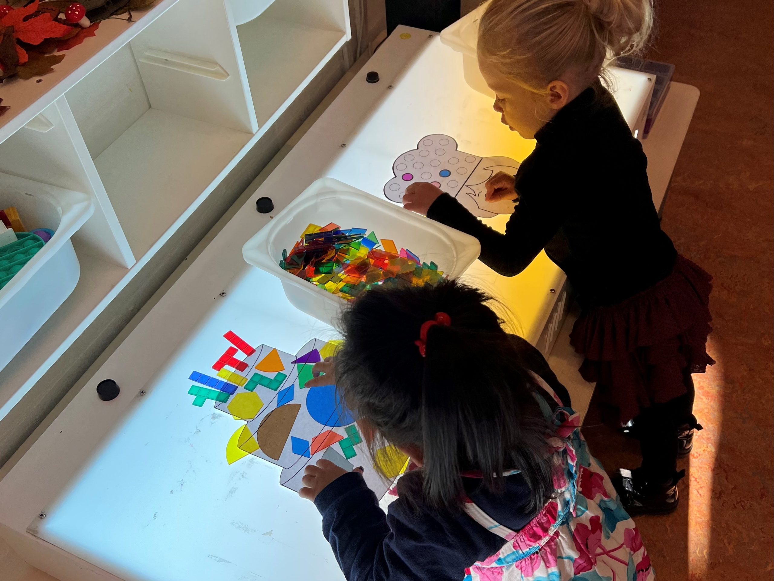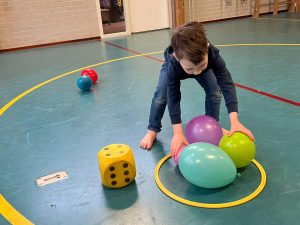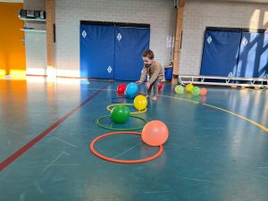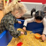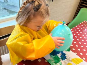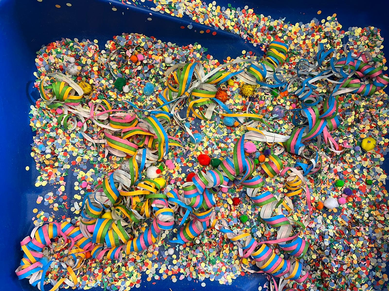 Het recente thema dat volgens de Startblokken-methode behandeld wordt, is ‘Wij vieren feest’. Nina vertelt dat de ruimtes met hulp van de kinderen versierd worden en dat er samen taartjes gebakken worden. “We vertellen wat feest is, en hebben een thematafel ingericht. In de huishoek liggen materialen die passen bij het vieren van feest. Kinderen kunnen helpen met versieren en kunnen het feestje ook echt spelen. Zo zijn er muziekinstrumenten, feestversiering en materialen om zelf taartjes en cakejes te bakken. Ook kunnen de kinderen experimenteren met ongevormde materialen. Zo staat er nu een lichtbak met gekleurde speelrijst op de groep en een zandtafel. In de zandtafel kunnen uiteindelijk ook weer materialen worden toegevoegd zodat er taartjes kunnen worden gemaakt.”