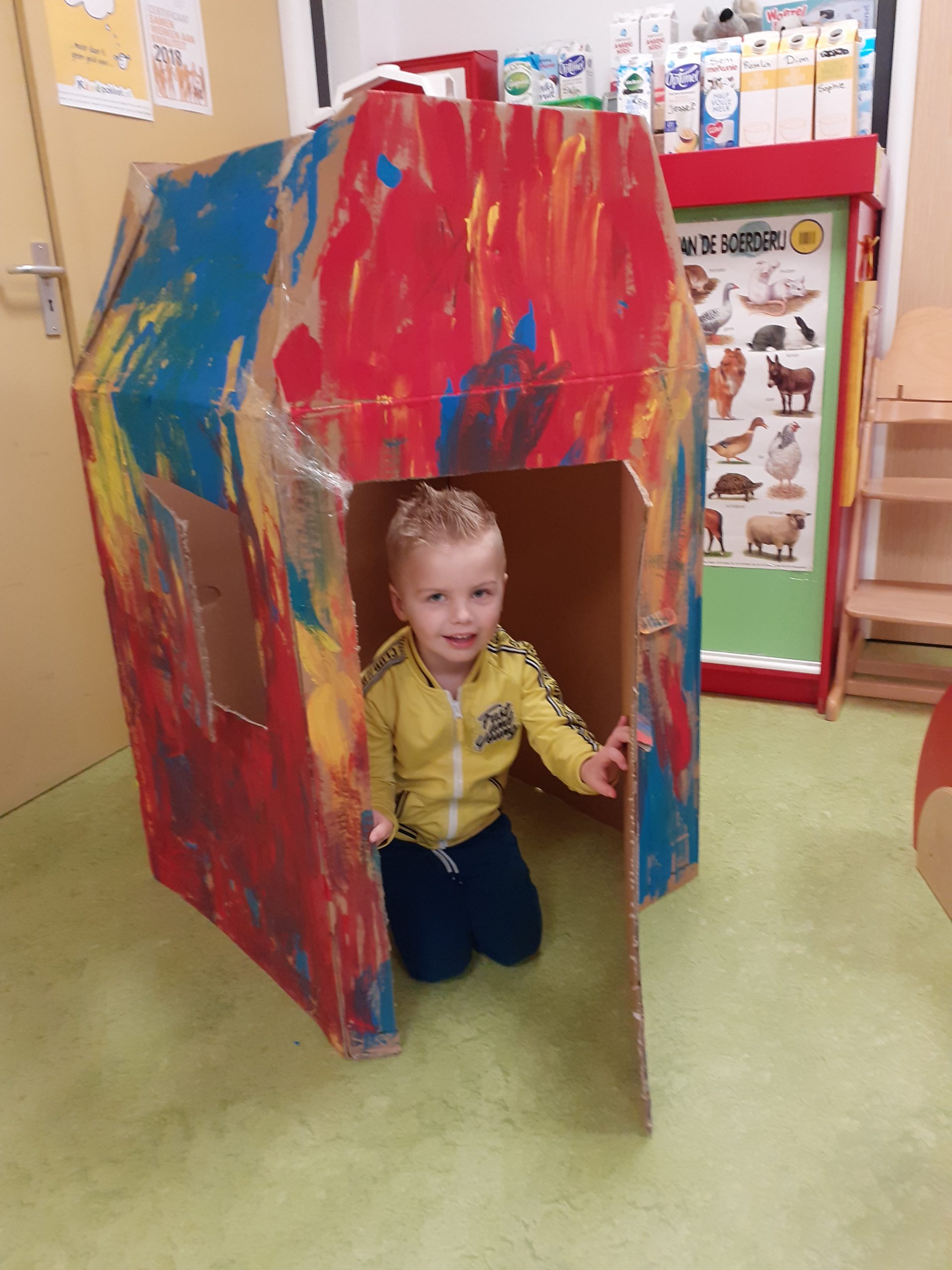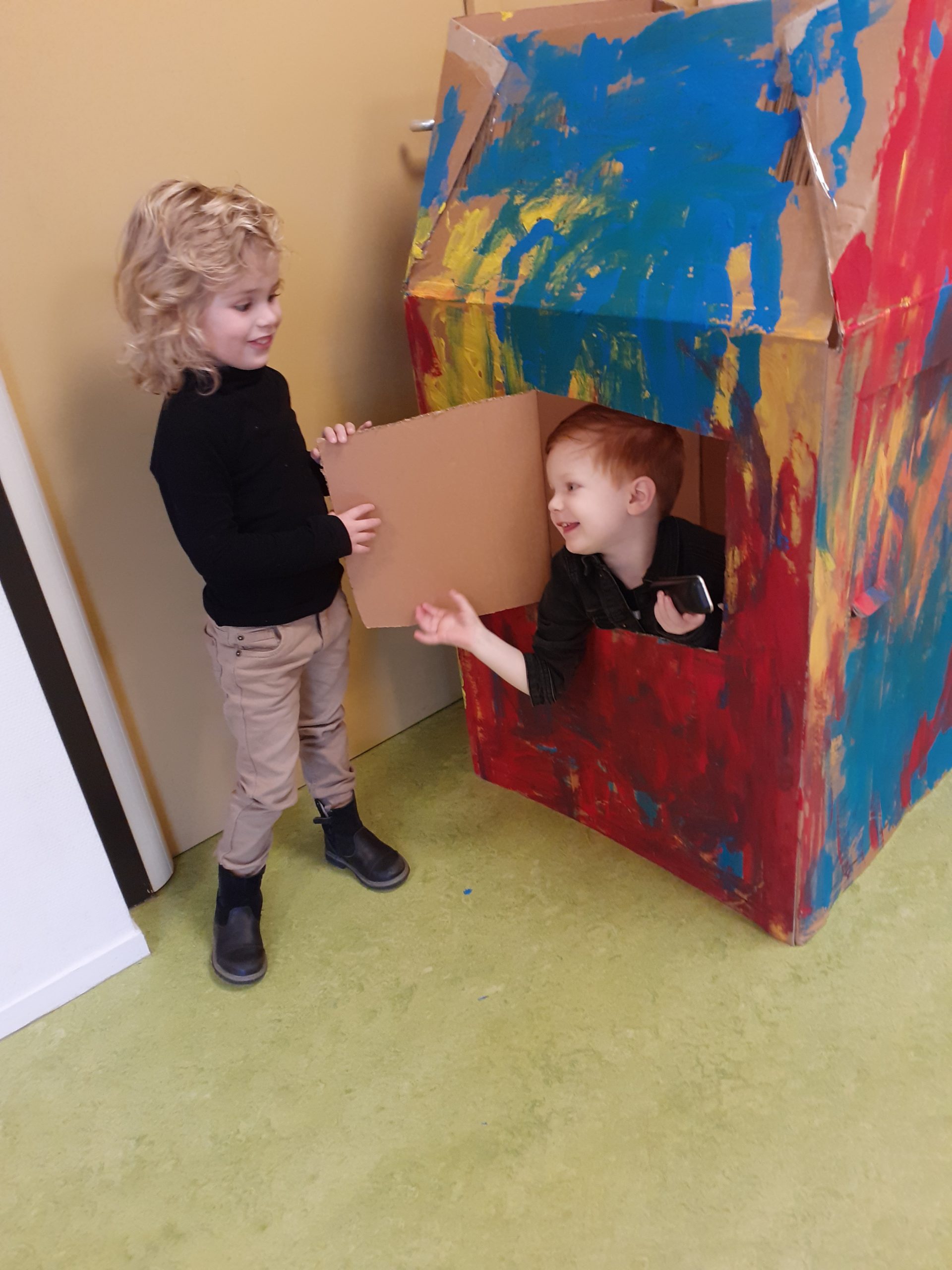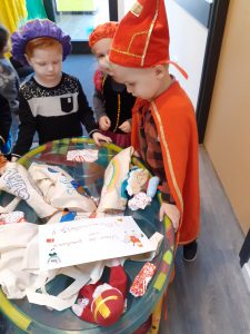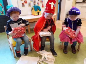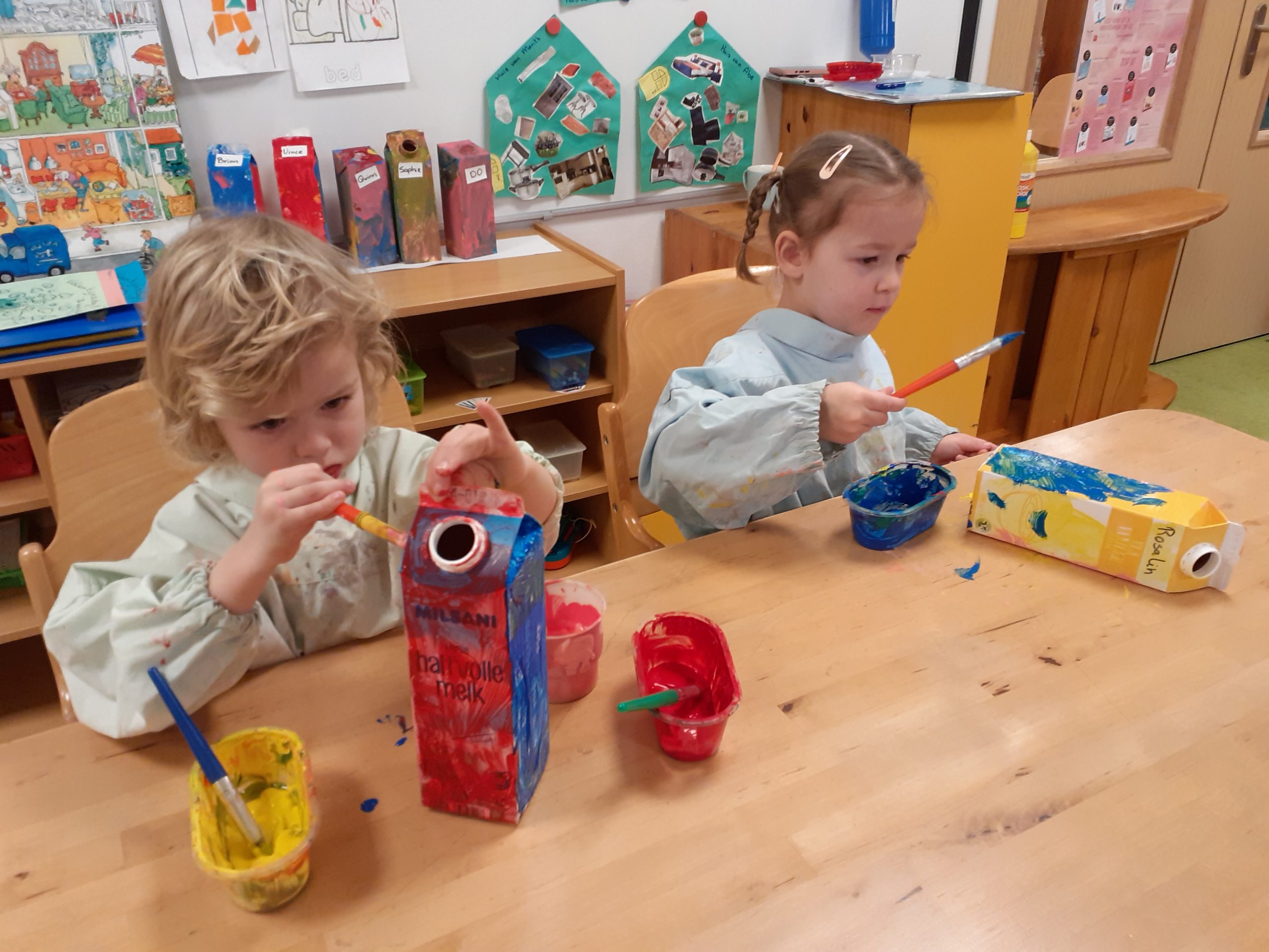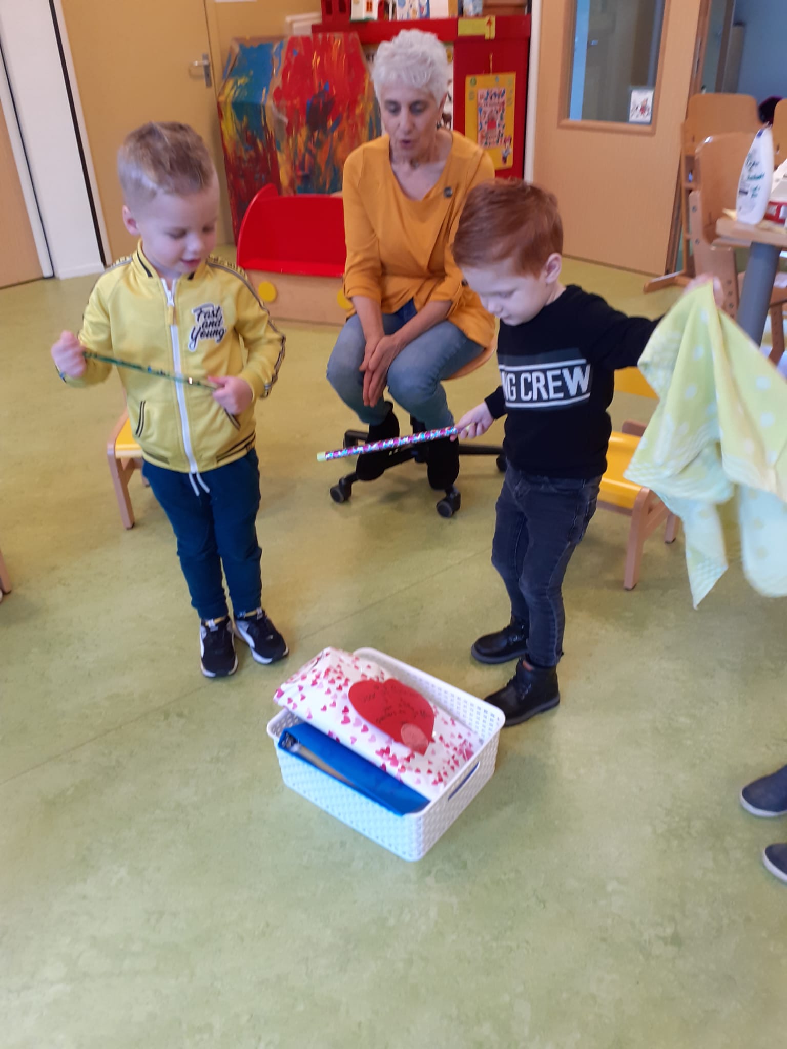 Zo hebben we tegelijkertijd alle kleuren benoemd en gebruikt. Met een verfschort aan zijn ze hier heel mooi mee bezig geweest. Sommige peuters hadden dezelfde kleur als het cadeau! Daarna hebben we een mooie kleur papier uitgezocht en hebben de peuters geholpen met inpakken. Daarna een mooi hart voor mama gekleurd en aan het pakje gehangen. Toen mocht het mee naar huis en gingen ze het goed verstoppen voor mama. Onder het bed, in hun eigen kast of sommigen achter het gordijn.