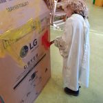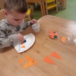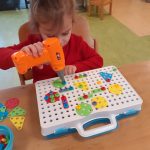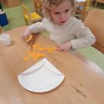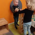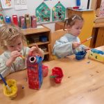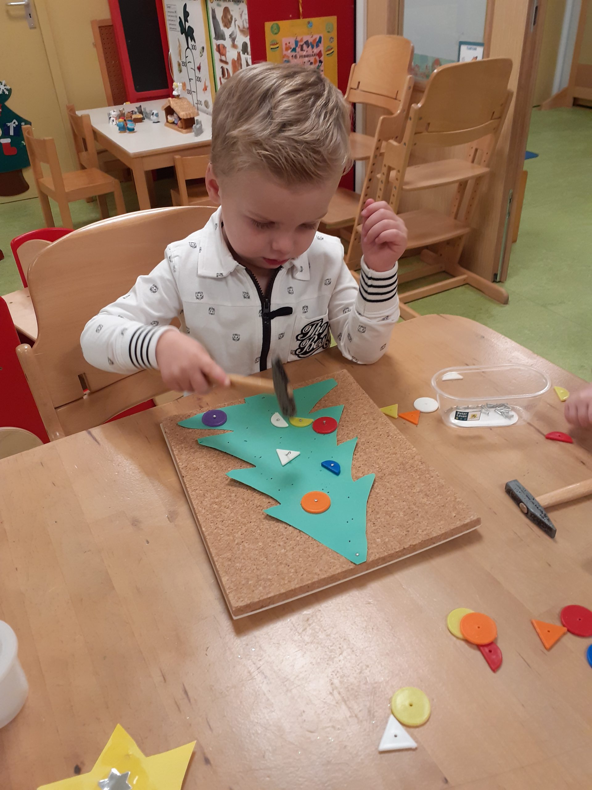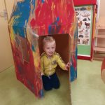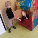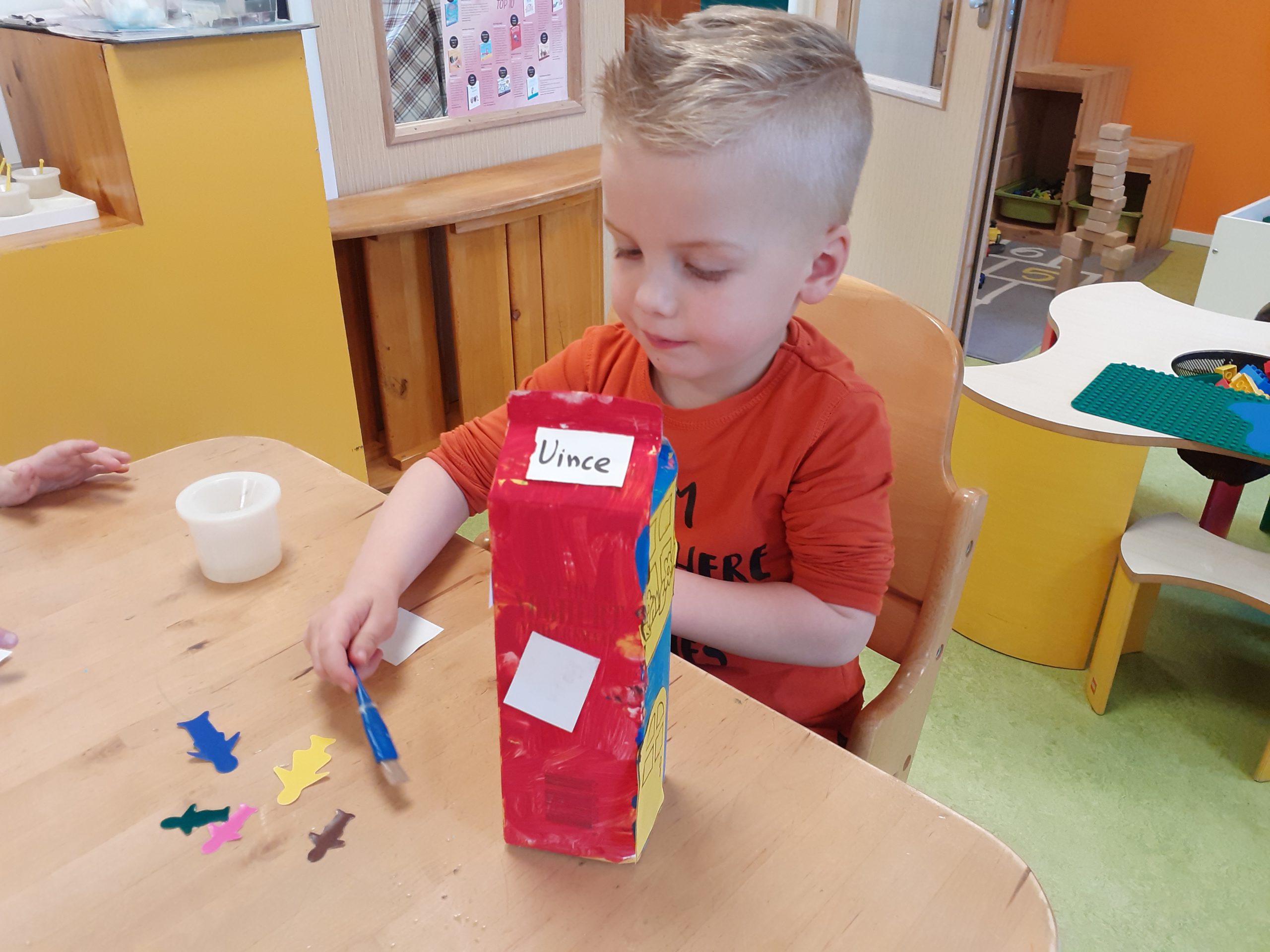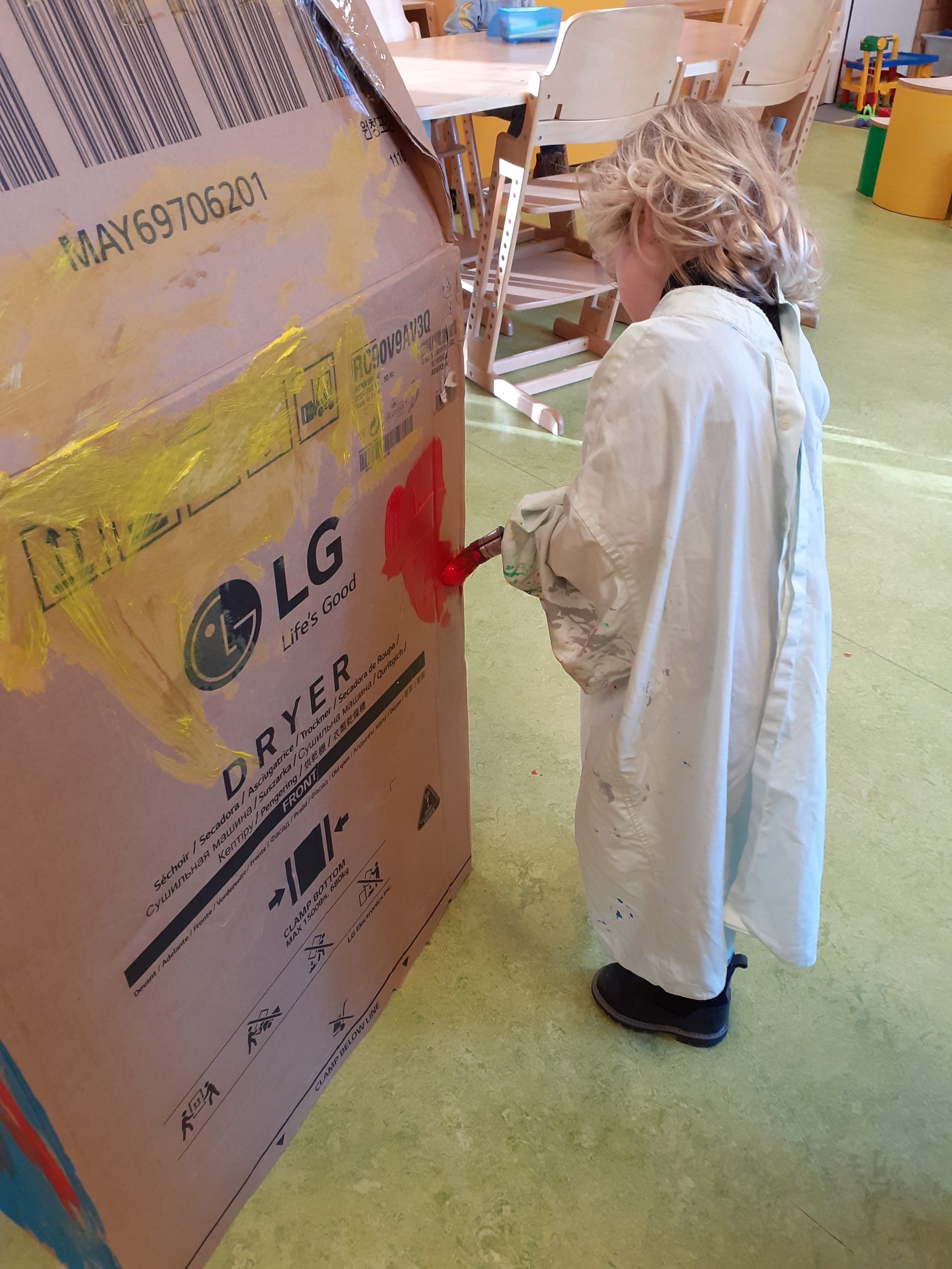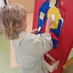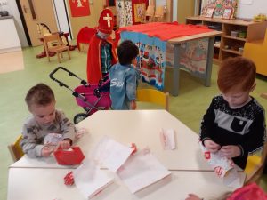 Zo hebben we tegelijkertijd alle kleuren benoemd en gebruikt. Met een verfschort aan zijn ze hier heel mooi mee bezig geweest. Sommige peuters hadden dezelfde kleur als het cadeau! Daarna hebben we een mooie kleur papier uitgezocht en hebben de peuters geholpen met inpakken. Daarna een mooi hart voor mama gekleurd en aan het pakje gehangen. Toen mocht het mee naar huis en gingen ze het goed verstoppen voor mama. Onder het bed, in hun eigen kast of sommigen achter het gordijn.