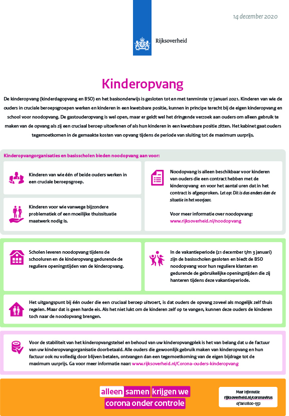 Woensdagavond 3 februari hebben wij het nieuwe protocol m.b.t. de heropening van de kinderopvang ontvangen (opgesteld door de Brancheorganisatie Kinderopvang, de Branchevereniging Maatschappelijke Kinderopvang, Boink, Voor Werkende Ouders en FNV in samenspraak met SZW). Wij volgen de voorgeschreven maatregelen. Op 5 februari hebben wij al onze ouders een mail gestuurd om hen te informeren over de maatregelen om het heropenen van de kinderopvang zo goed mogelijk te laten verlopen.