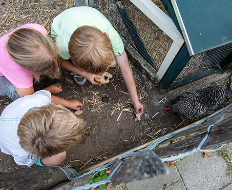 Het schoolplein van de K. Norelschool, dat aan ons plein grenst, gebruiken we onder begeleiding. Dat zorgt voor de nodige afwisseling. Verder hebben we buiten ook nog een apart plein met onze kip en konijn. Ligt er alweer een ei? Moeten de hokken verschoond worden?
