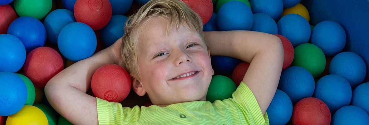 Ook in onze centrale, grote hal mogen kinderen spelen. Daar zijn matten, stapstenen, een speelkeuken en een glijbaan. En zo af en toe zetten we daar ons springkussen neer.