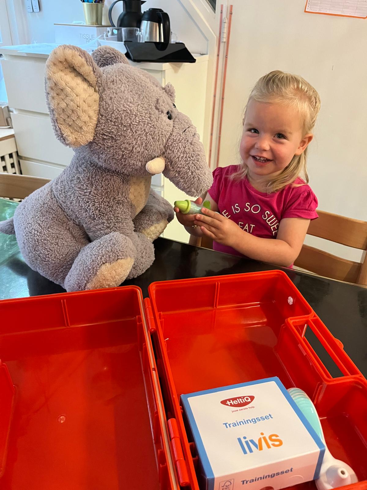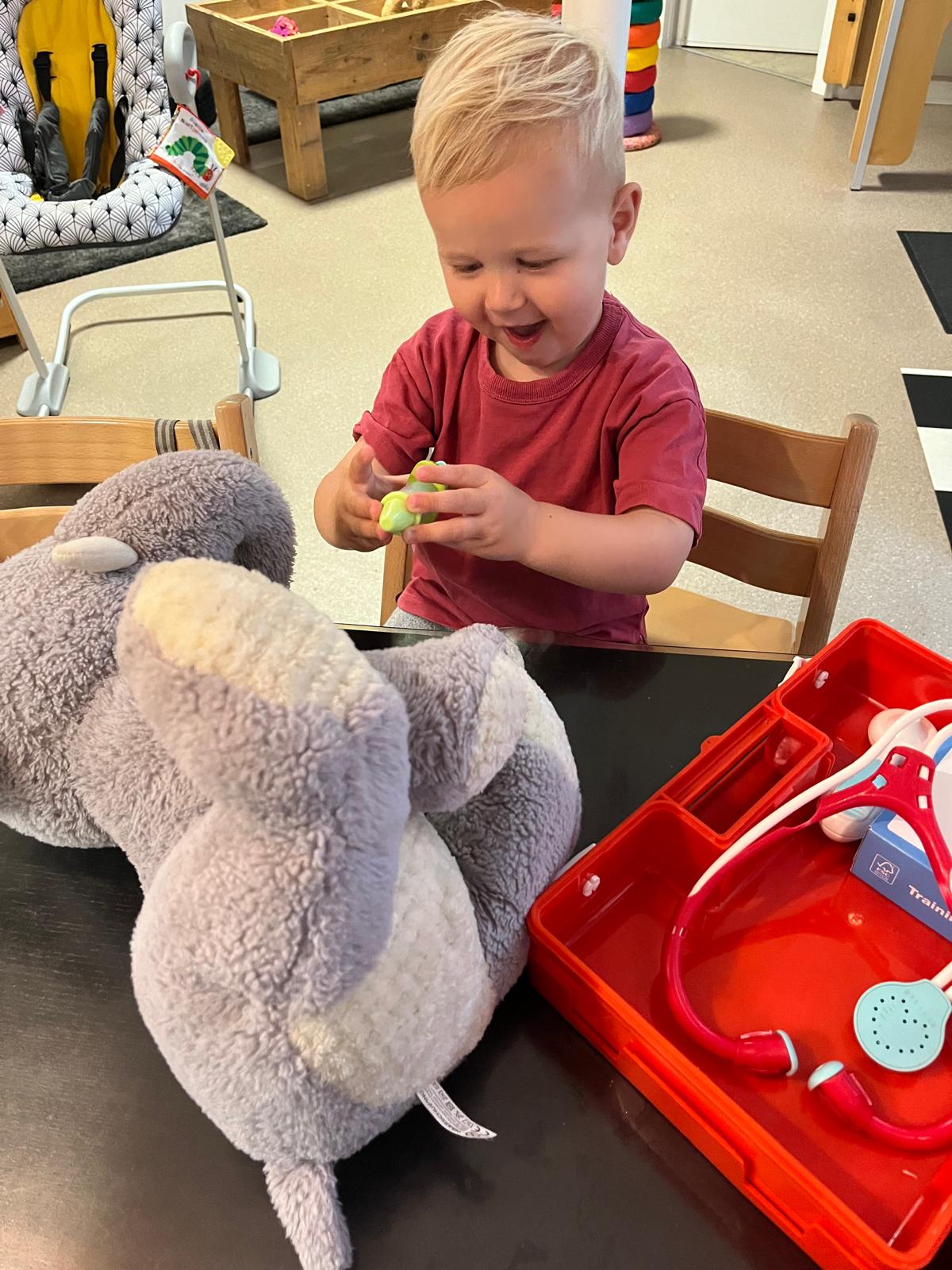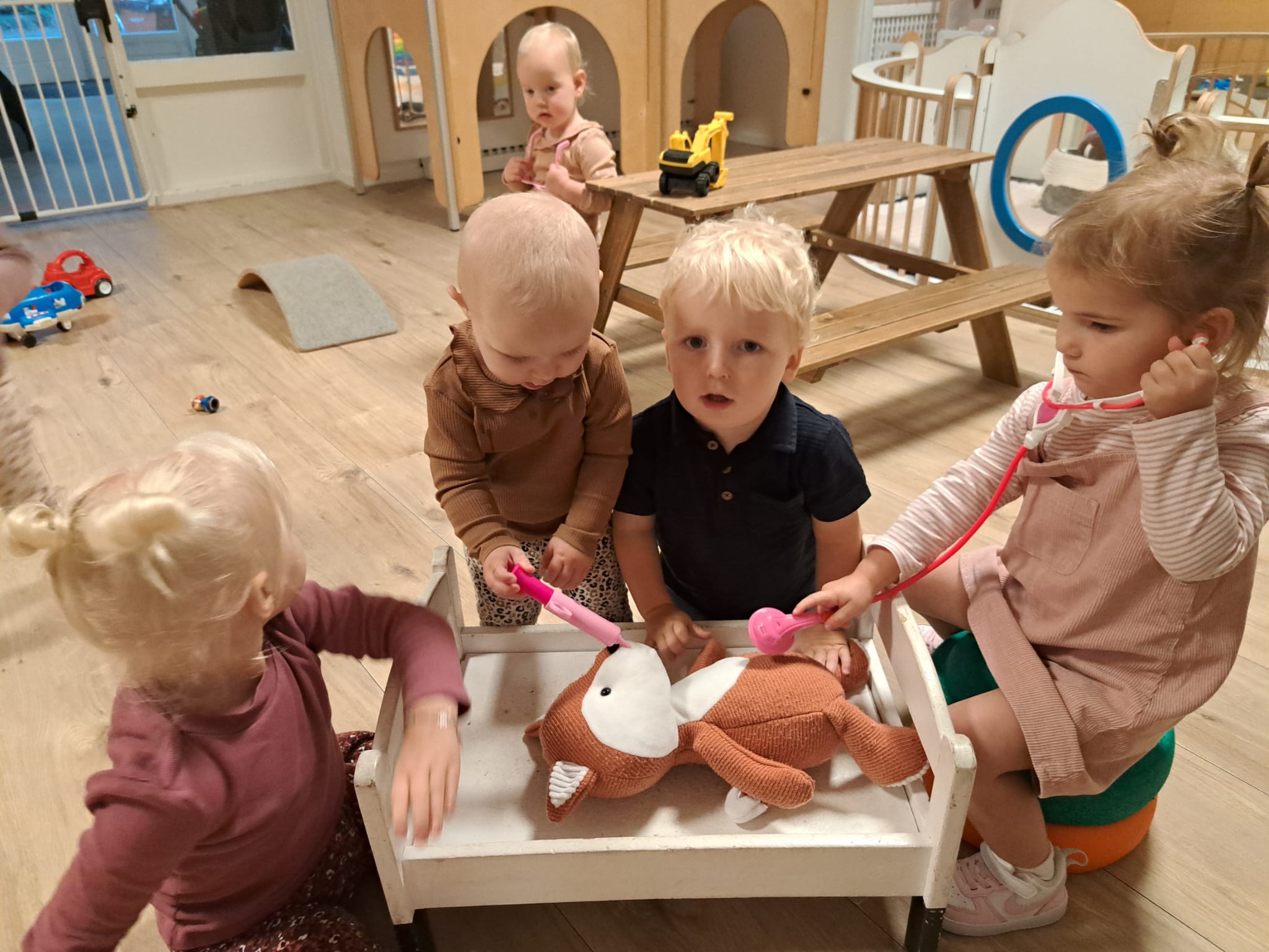 De kinderen zijn druk aan het ontdekken, wat voor materiaal het is en hoe het gebruikt kan worden. De stethoscoop, de spuitjes, de pleisters en het verband is bij de kinderen favoriet. De groepsknuffels Ollie de Olifant van de Kwick-groep en Felix de Vos van de Kidz-groep worden ook bij dit thema betrokken. Ze zijn allebei ziek en wij gaan ze weer beter maken. Aan het einde van dit thema krijgt ieder kind een doktersdiploma. En we zien nu al hele goede dokters.