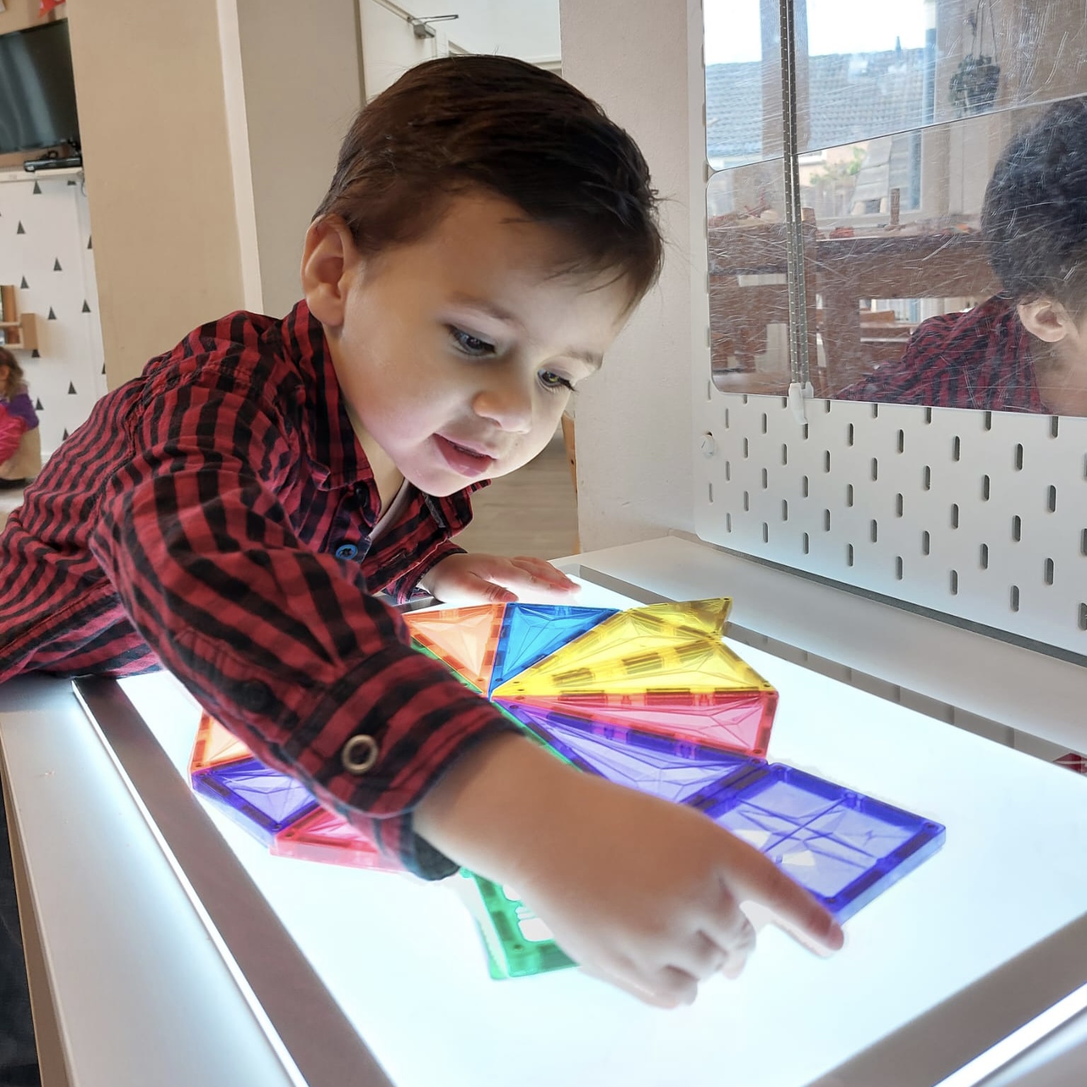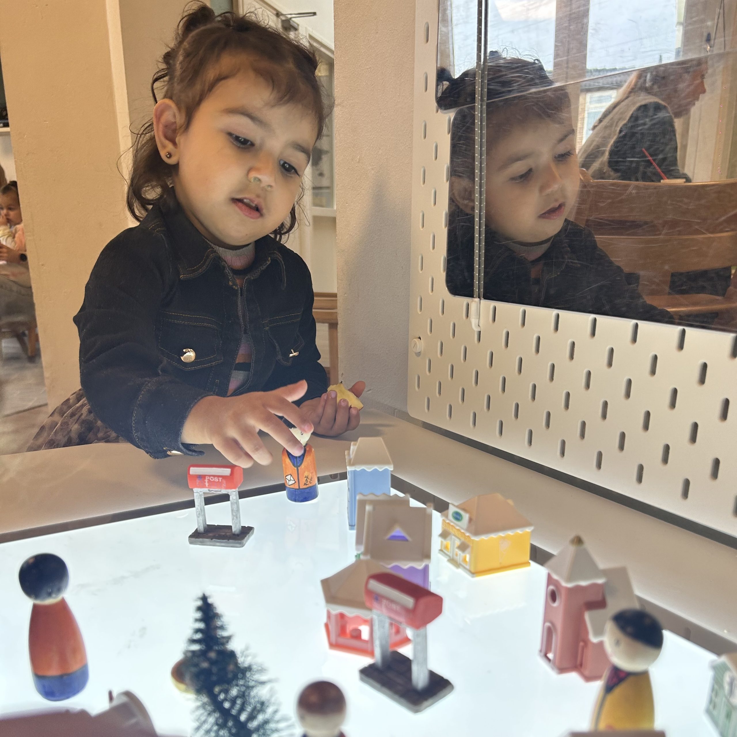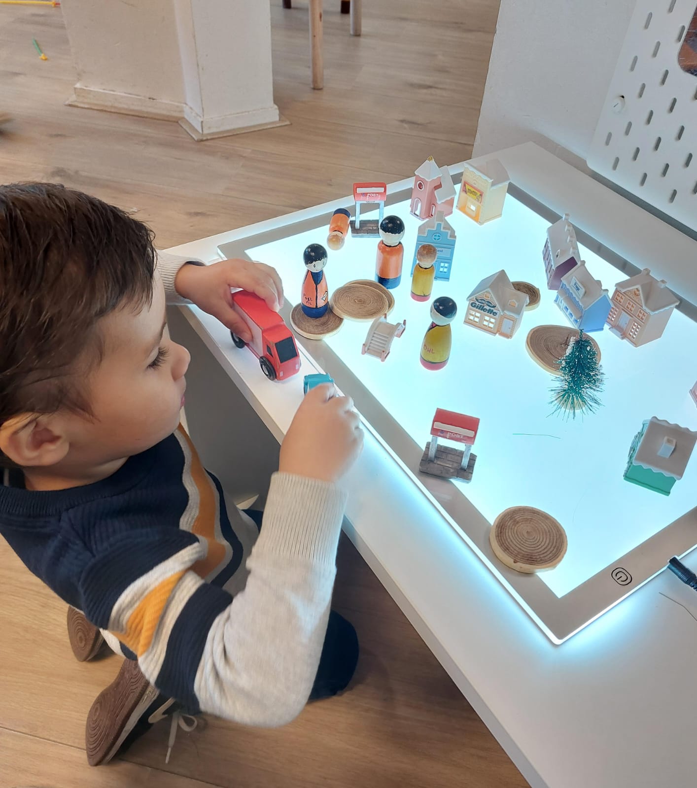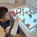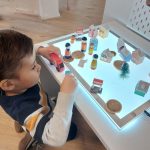 In de senso-motorische bak zit spliterwten met bonen. Daarbij hebben we dieren en boomschijfjes en stammetjes gedaan. Dit soort materialen zijn gericht op de zintuiglijke en motorische ontwikkeling. Onder zintuiglijke ontwikkeling verstaan we horen, ruiken, voelen, zien, en proeven. Sommige kinderen vinden het alleen al heerlijk om met hun handen door de erwten en bonen te gaan of deze tussen hun vingers te laten glippen. Anderen gaan al veel meer manipuleren met de andere materialen of laten de dieren bewegingen maken, zoals op een schijfje staan. Omdat er twee bakken in de tafel zijn, kunnen er twee kinderen tegelijk spelen. Soms ieder op zichzelf maar er ontstaat ook vaak prachtig samenspel. En ze weten algauw dat het niet bedoeld is om in de mond te stoppen.