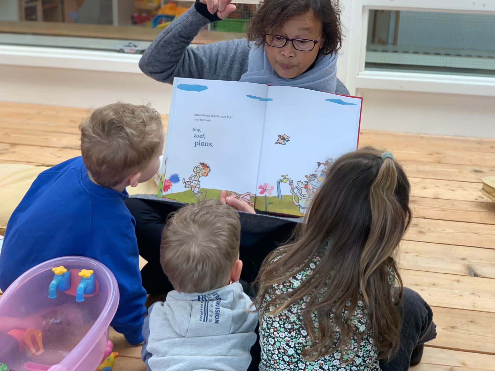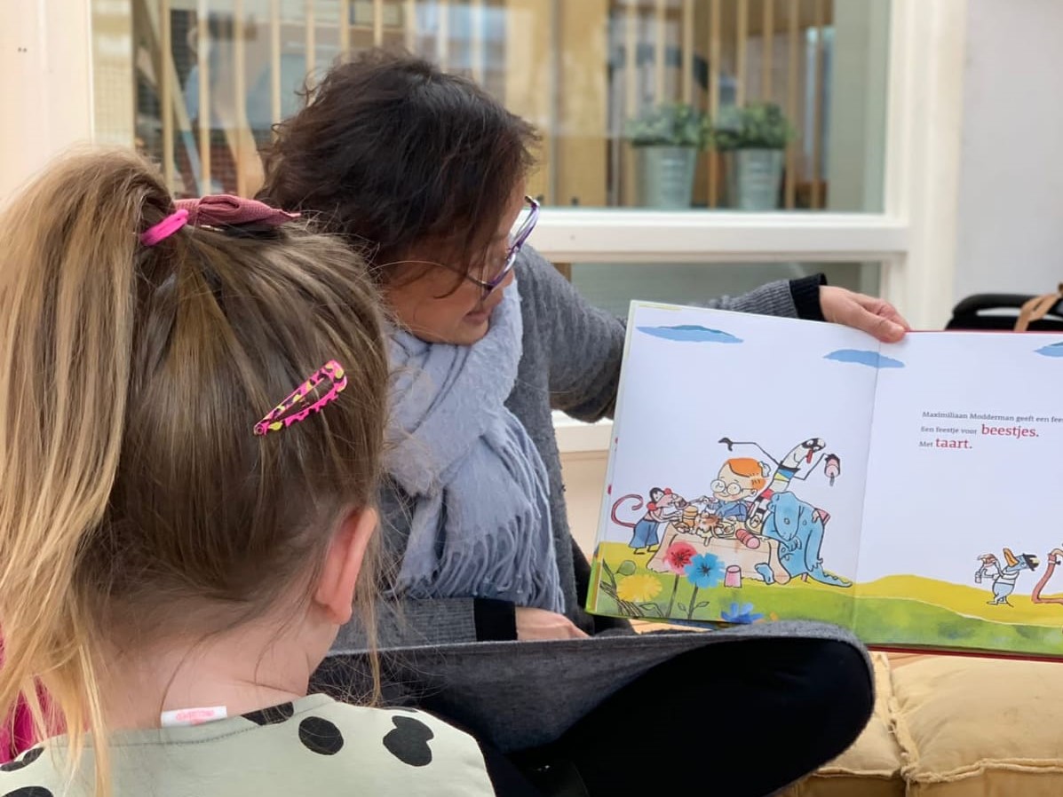 Onze oud collega Trudi kwam gezellig langs om de peuters van ’t Hummelhoekje voor te lezen uit het boek: “Maximiliaan Modderman viert een feestje”. Wat werd er aadachtig geluisterd!