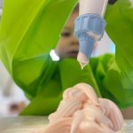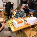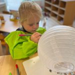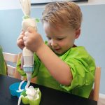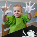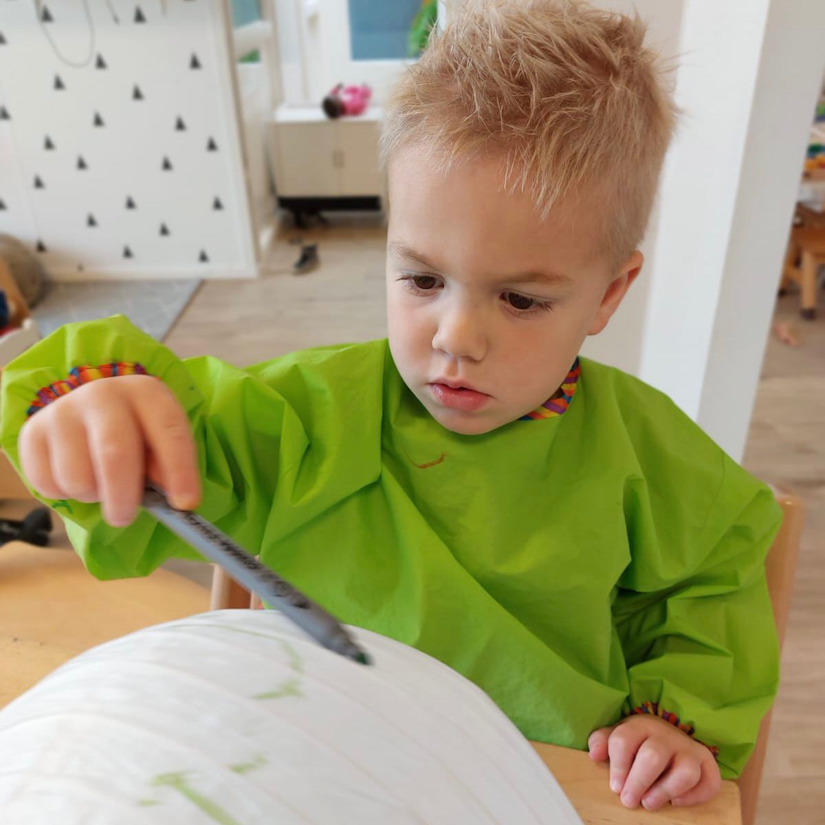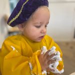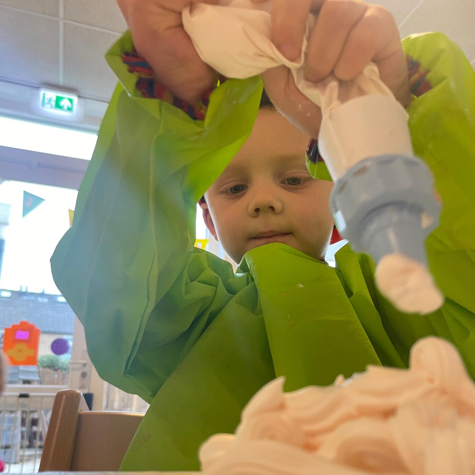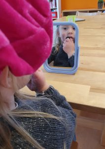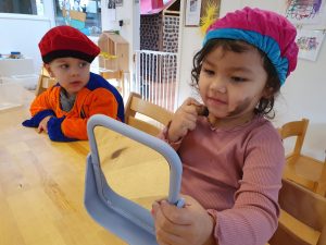 Natuurlijk zijn er ook verkleedkleren, zodat kinderen die dat leuk vinden een échte Sinterklaas of Piet kunnen worden. En wat is er leuker om jezelf daarbij ook van heuse roetvegen te voorzien! Dus mogen de peuters met een kurk waar roet aanzit hun eigen gezicht `schminken`. Daarbij kunnen ze in de spiegel kijken om te zien of het roet op de goede plek komt. Dat levert ingespannen koppies op en wat zien ze er daarna prachtig uit!!