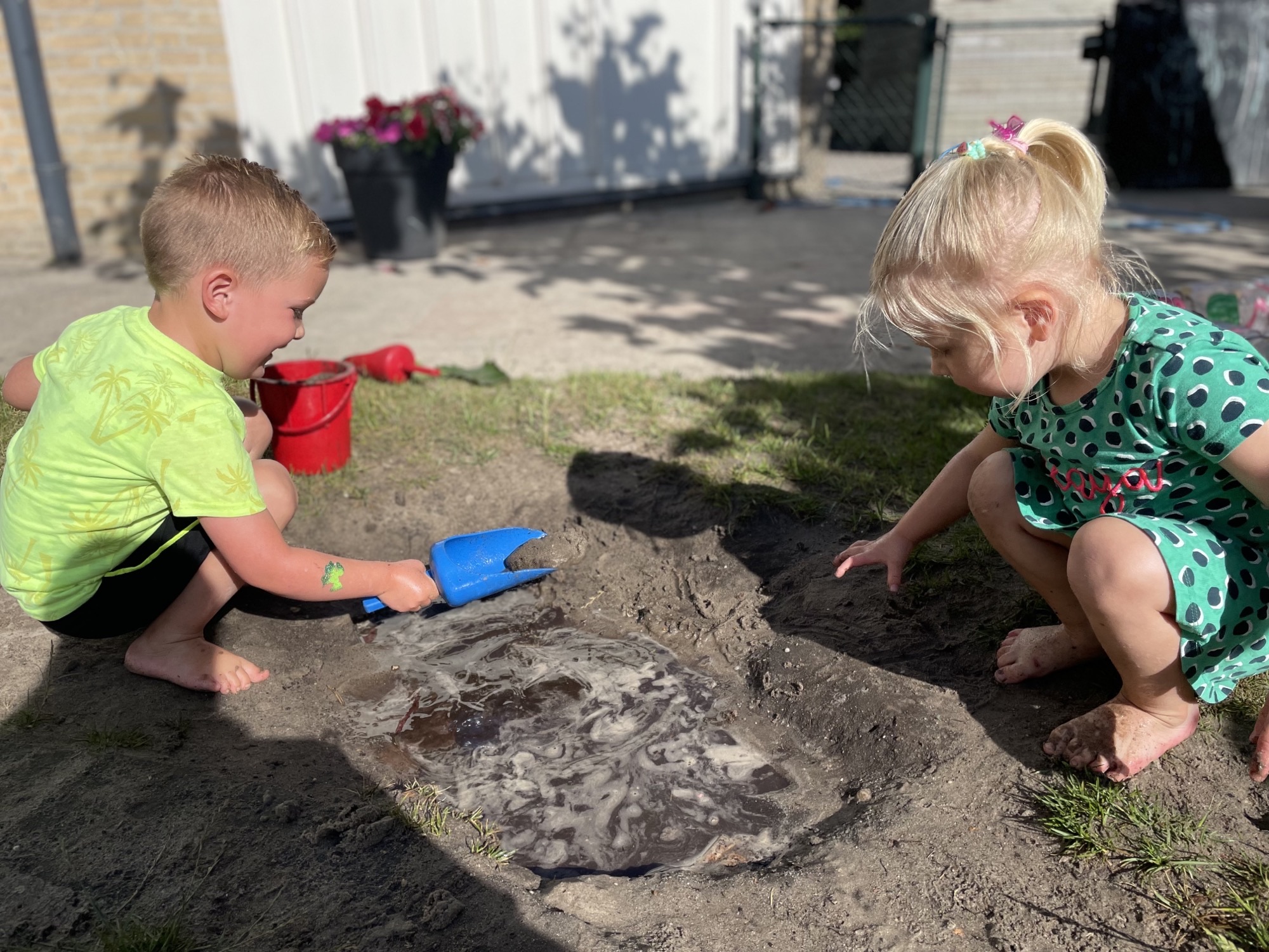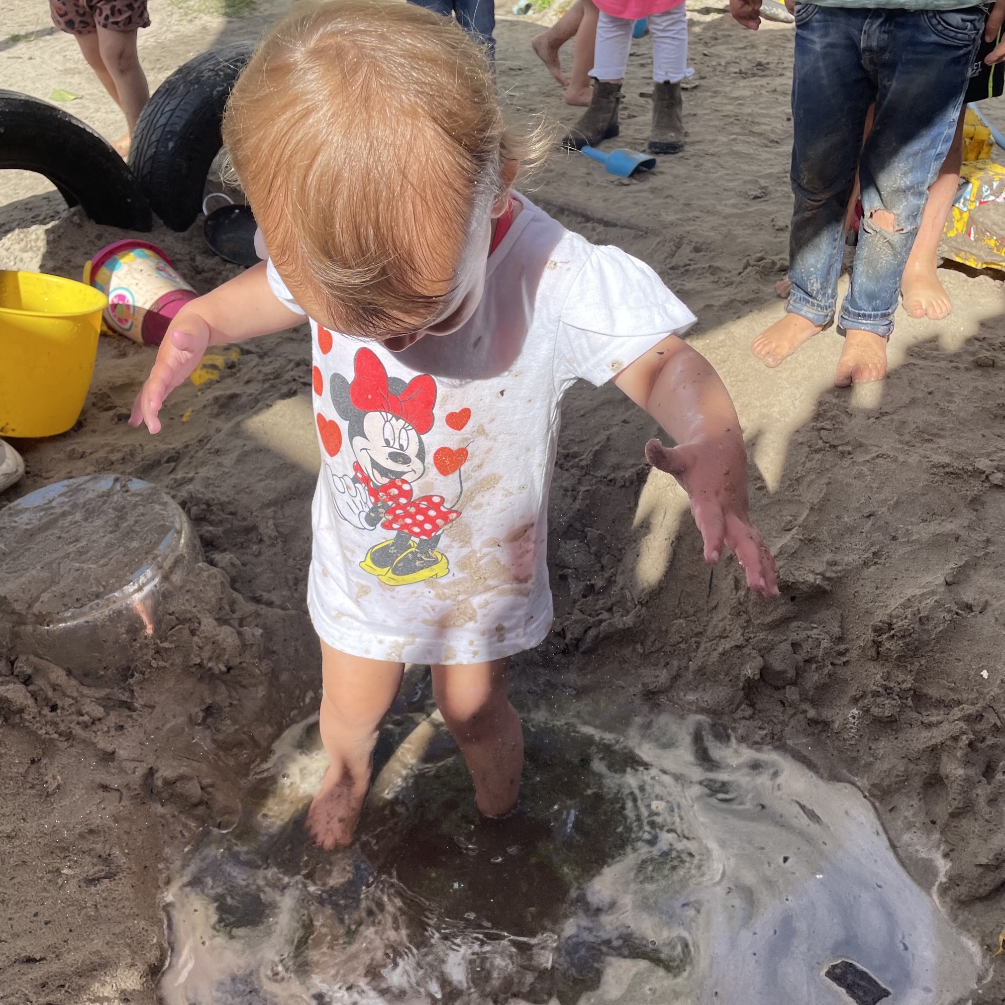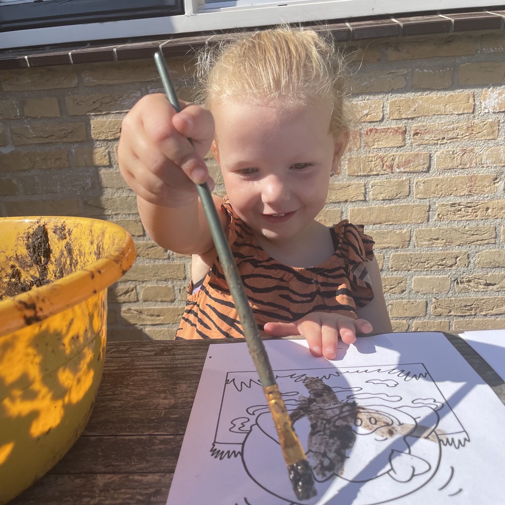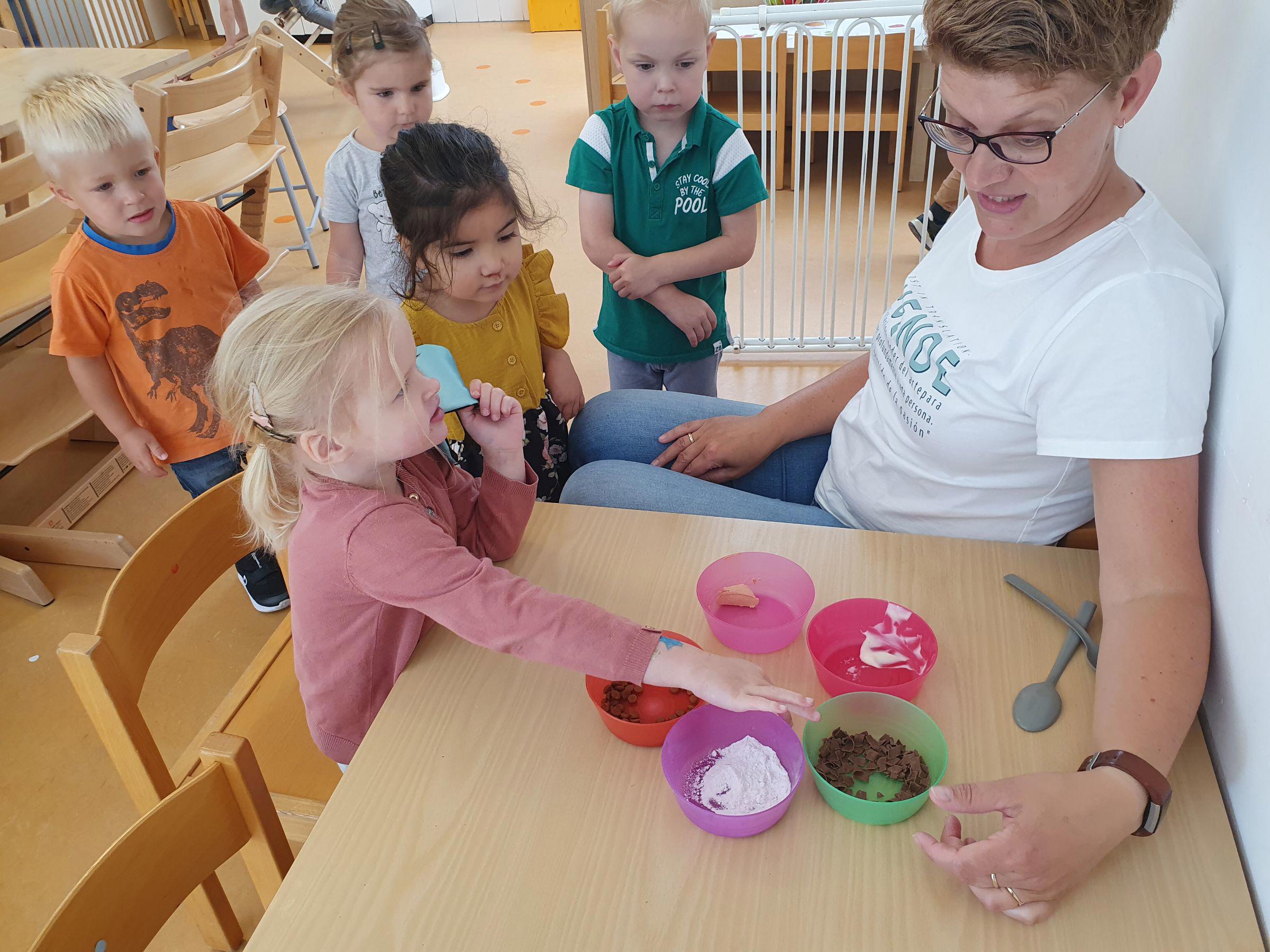 Op de lichttafel liggen 2 emmers die wij hebben uitgeprint, met verschillende gekleurde fiches eromheen. Met deze fiches kunnen de kinderen hun eigen emmer versieren. Door het licht van de tafel krijgen de gekleurde fiches een mooie felle kleur. Op de lichttafel krijgen heel veel materialen een extra dimensie: Extra felle kleuren, meer contrast en het ontstaan van schaduwen. Zodra je 2 verschillende fiches boven op elkaar legt ontstaat er een andere kleur. Als we een blauw fiche voor onze ogen houden wordt in 1 keer de hele groep blauw, dat is grappig!!