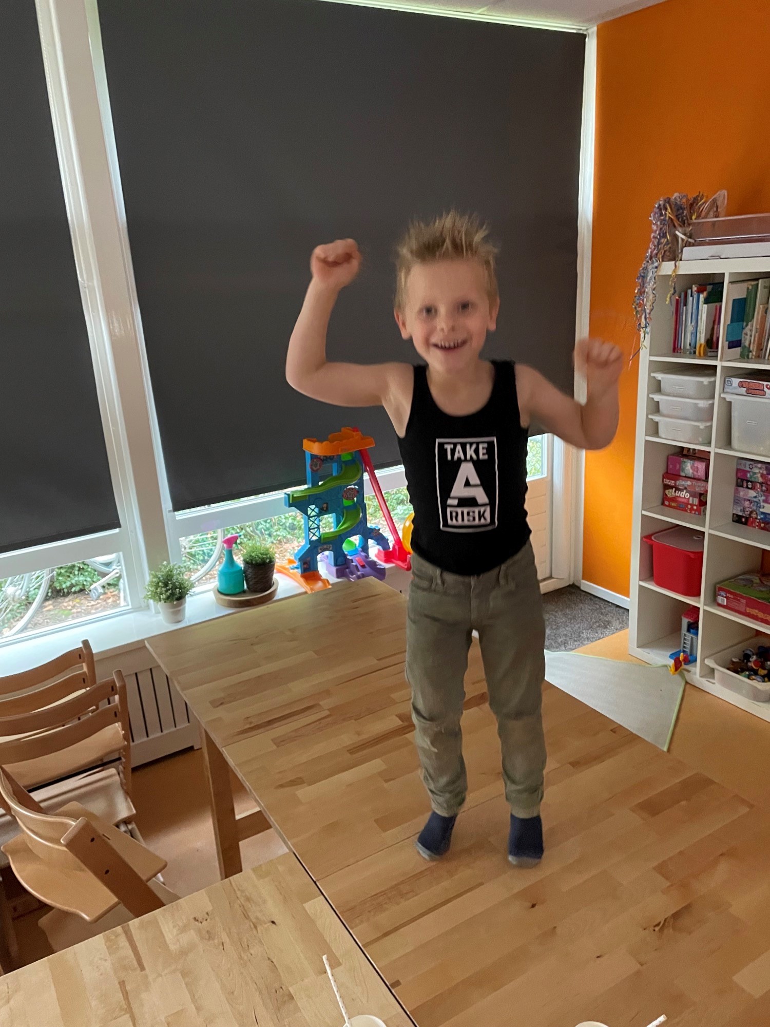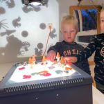 Er is een inpaktafel, waar blokjes ingepakt kunnen worden. Er liggen stukken inpakpapier en plakband op een houder. Het is nog niet zo makkelijk om papier om een blokje te vouwen, het plakband van de rol scheuren en dan zo opplakken dat het papier vastzit. Gelukkig maakt het niet uit dat het blokje er uitvalt of niet in het papiertje zelf zit, samen ermee bezig zijn is al mooi.