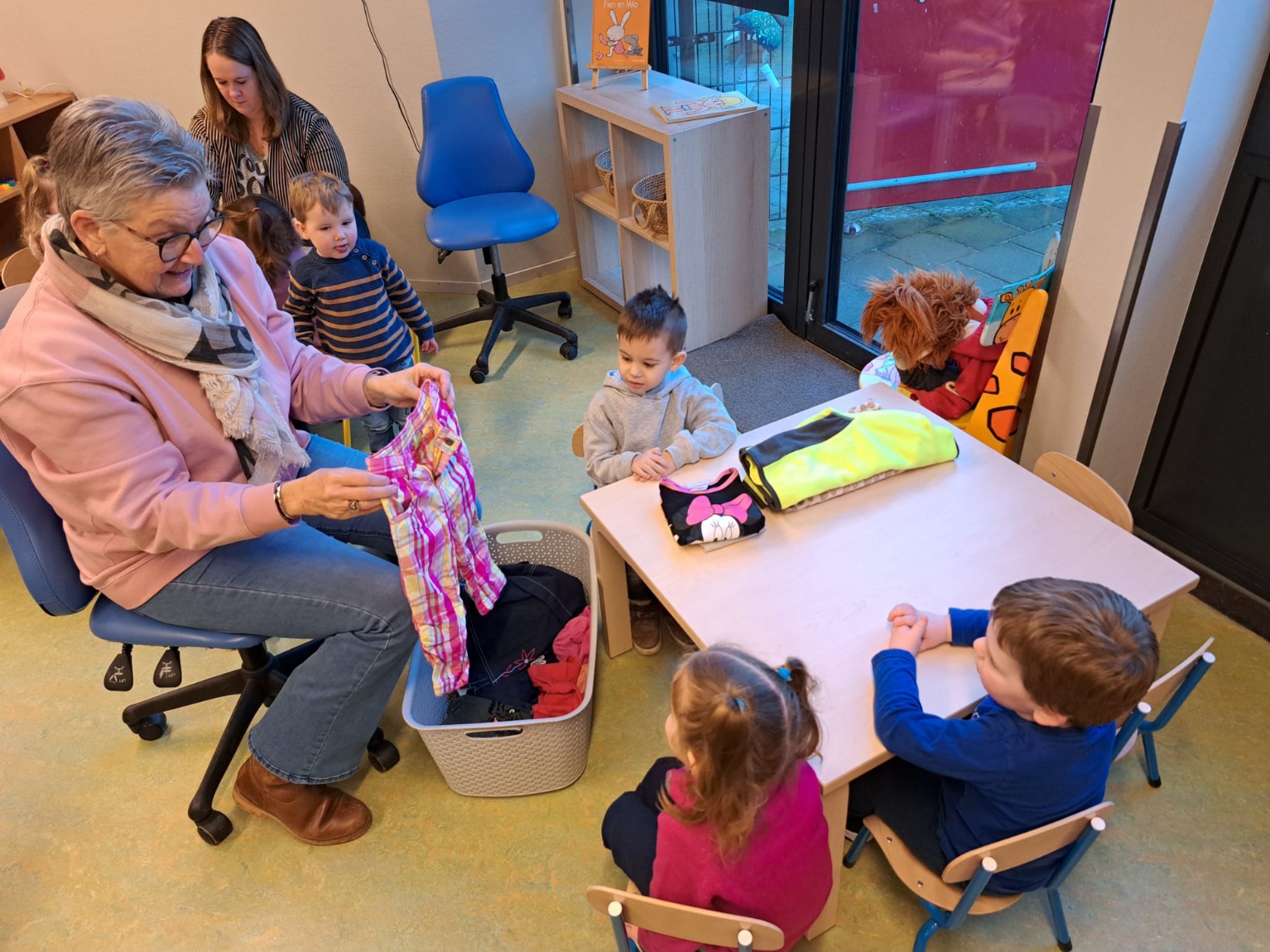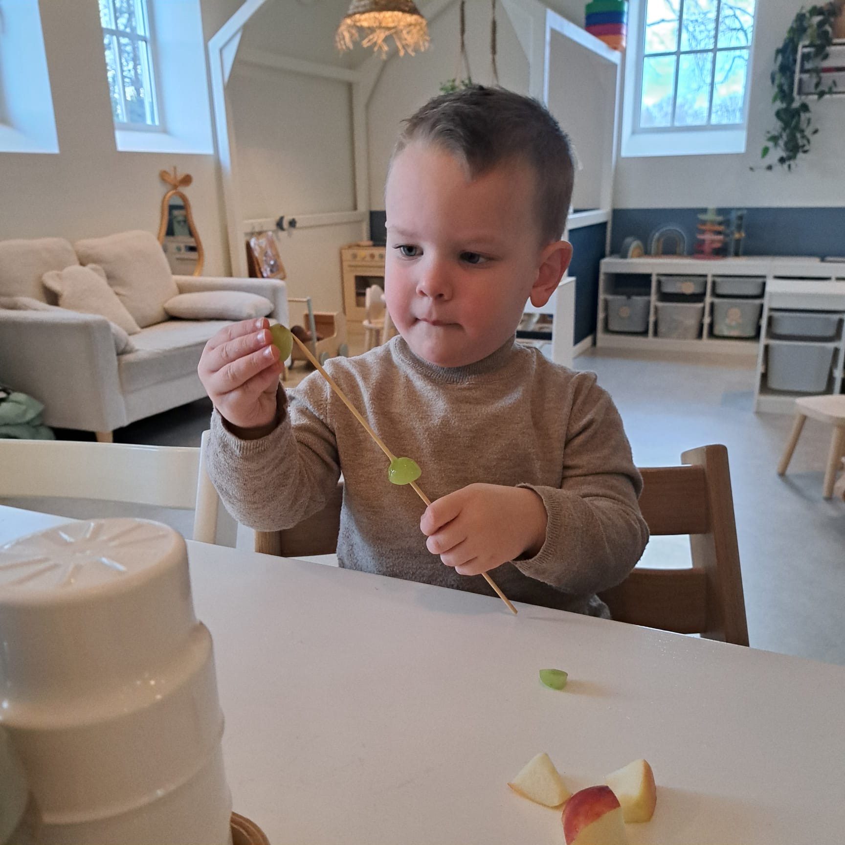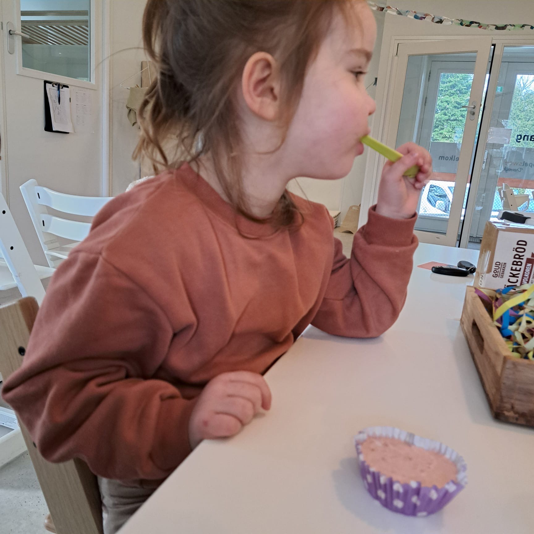 De eerste weken was dat nog wel wennen want we kregen nog vaak de vraag wie de koekjes mocht uitdelen. Nu is iedereen eraan gewend en wordt de tweede cracker ook met smaak weggewerkt. De kinderen mogen kiezen tussen een luchtige volkoren cracker, rijstwafel of vierkante cream cracker. Daarop mag kaas, smeerkaas, vegapaté, cervelaat, pindakaas. Als kinderen dan nog steeds trek hebben, dan mogen ze de schaal met groente (worteltjes, komkommer, tomaatjes) die ook altijd bij ons eetmoment aanwezig is, leegeten.