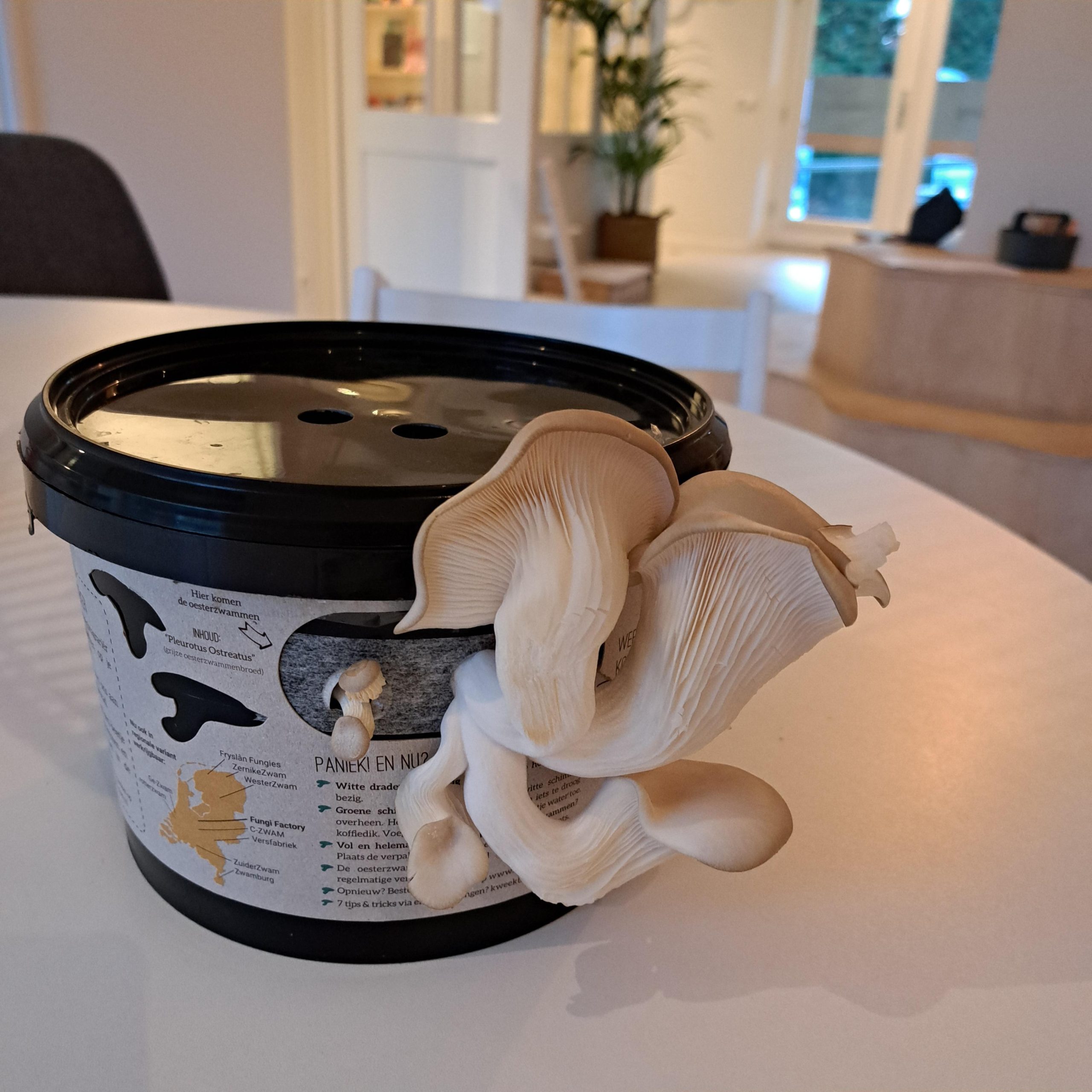 Iedere week kijken we wat er gebeurt in de emmer en zo nodig komt er weer nieuwe verse koffiedik boven op de witte schimmellaag. En dan ineens, na een aantal weken de schimmels te voeden, groeien er grote oesterzwammen uit de emmer. De kinderen draaien ze er zelf af. Vol trots nemen ze de oesterzwammen mee naar huis om thuis te bewonderen en hopelijk te proeven.