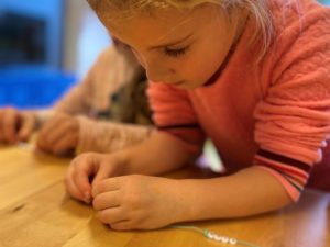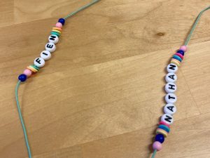 Naast het versieren van het lokaal zijn er deze week armbandjes met de eigen naam gemaakt. Tussen alle letterkraaltjes wordt er gezocht naar de letters van je naam. Samen met de letterkraaltjes en andere kraaltjes hebben de kinderen hun eigen naamarmbandje gemaakt!