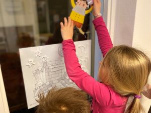 Van het boekje “Bij de dokter” hebben we alle bladzijden op groot papier met de tekst erachter op. Zeker voor de allerkleinsten is dit een mooie manier om kennis te maken met het verhaal. Het is heel duidelijk en ze kunnen makkelijk iets aanwijzen. Natuurlijk staat het boekje ook in de ontdekhoek, zodat de peuters er zelf, of samen in kunnen bladeren en kijken.
