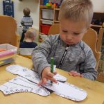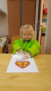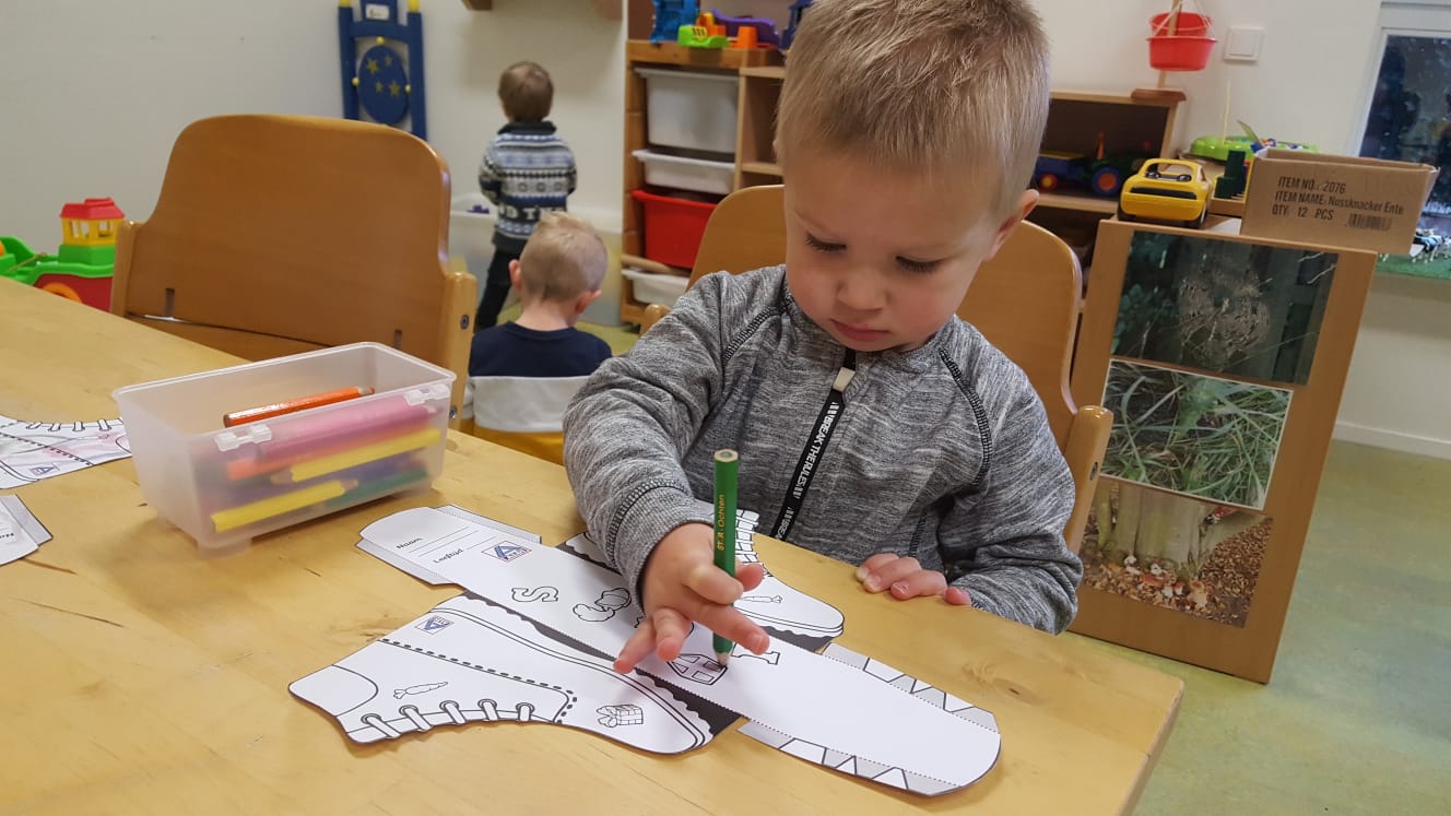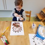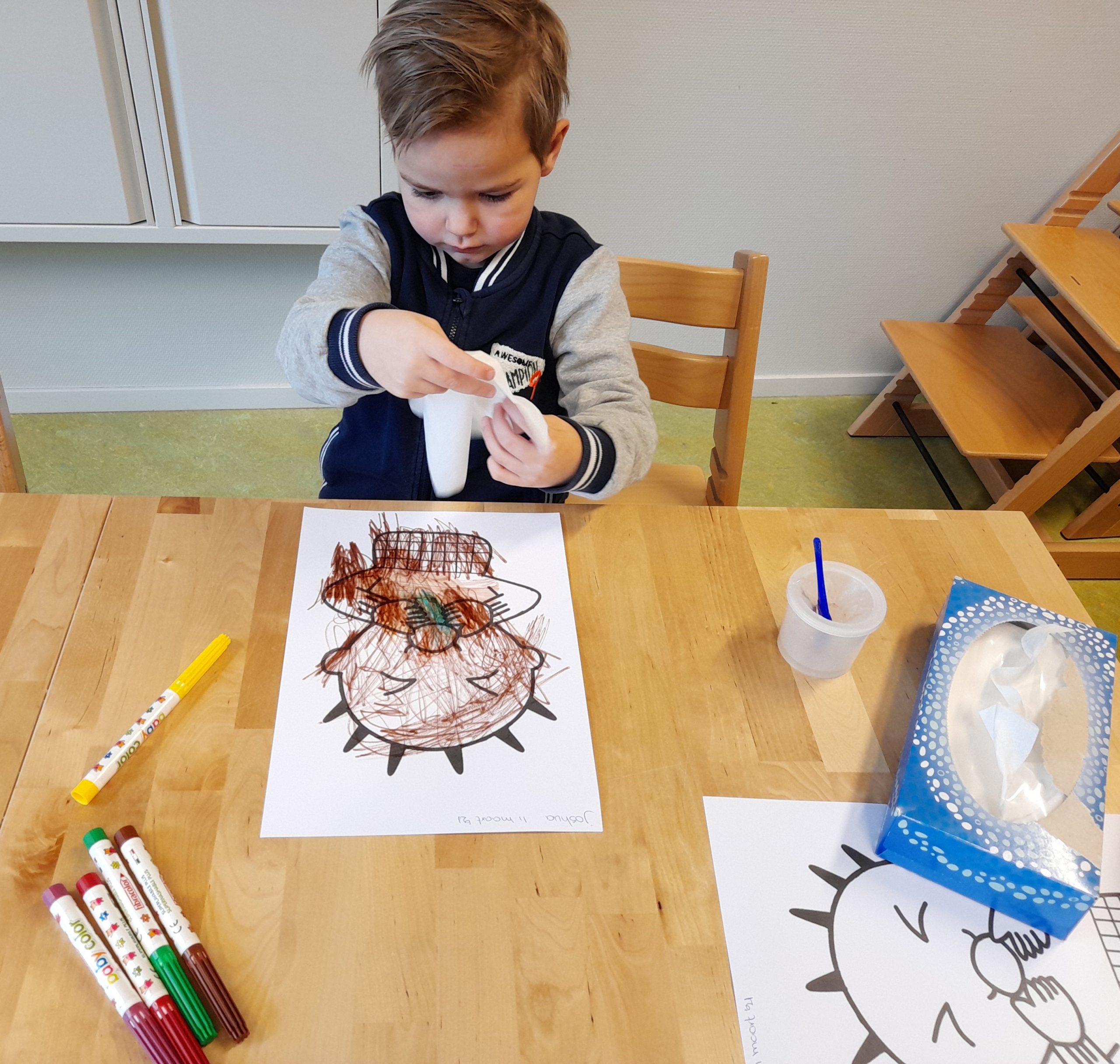 Bij peuteropvang de Buurtkabouters zijn we bezig met het thema “Ziek en Gezond”. We hebben het over hoe je moet hoesten/niezen (in je elleboog) en wanneer je je neus moet snuiten. De peuters kunnen een tekening van een kind inkleuren met stiften. Dan met de lijm de neus insmeren om het doekje erop te kunnen plakken. Alleen al de dop weer op de stift doen is een mooie oefening voor de fijne motoriek en de hand- en oogcoördinatie.