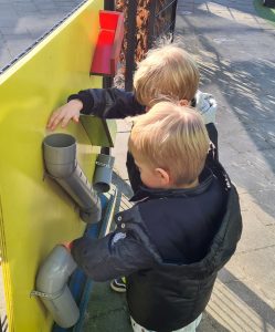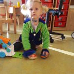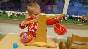 Zo zijn de peuters heel druk met het wegen van blokjes in de weegschaal. Als je aan de ene kant meer blokken legt, dan gaat dat bakje naar beneden. Als  je vervolgens in de andere weer blokken toevoegt,  gaat deze kant naar beneden. Blijven proberen en dan lukt het ineens om de bakjes op gelijke hoogte te krijgen!