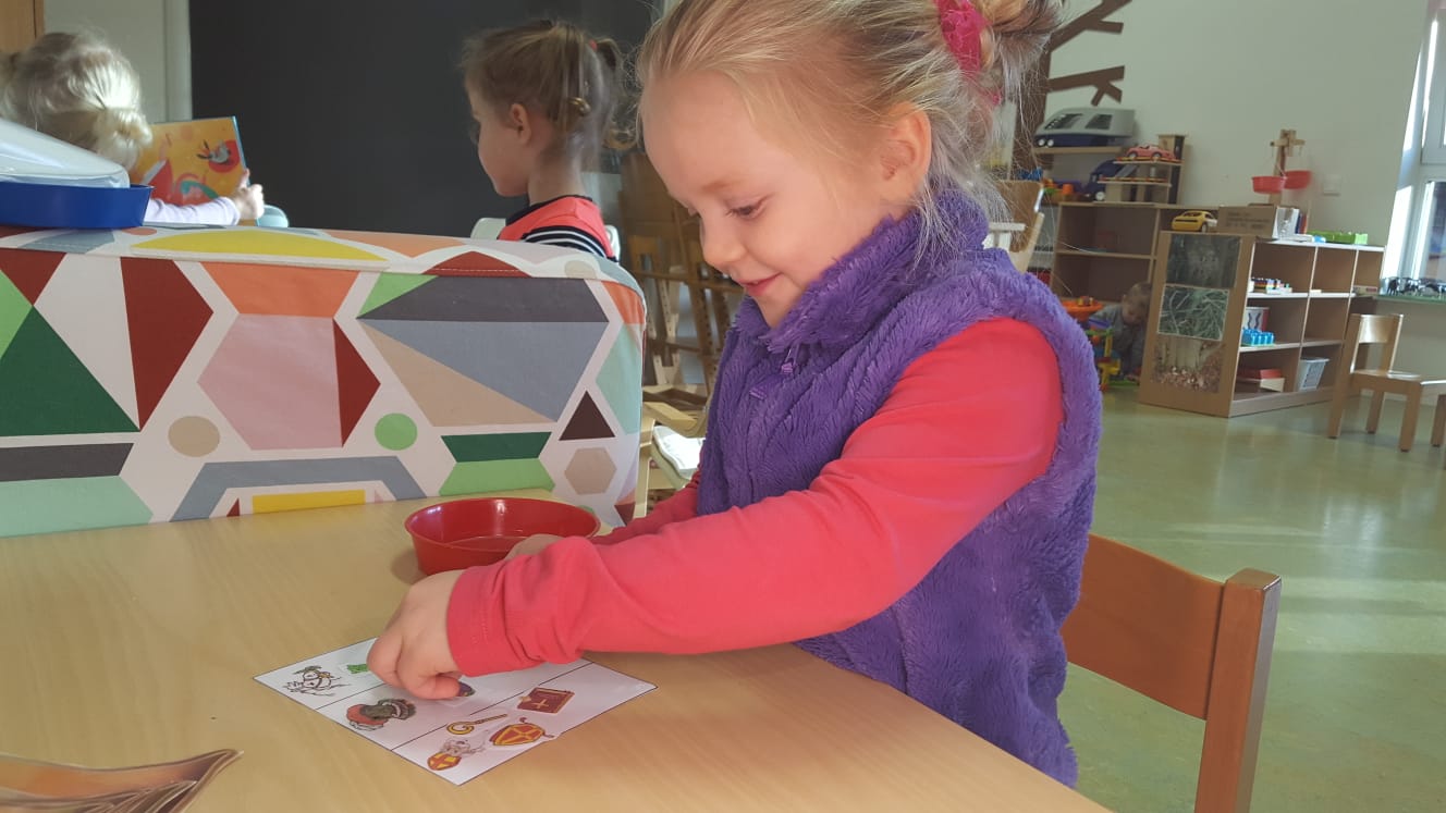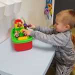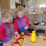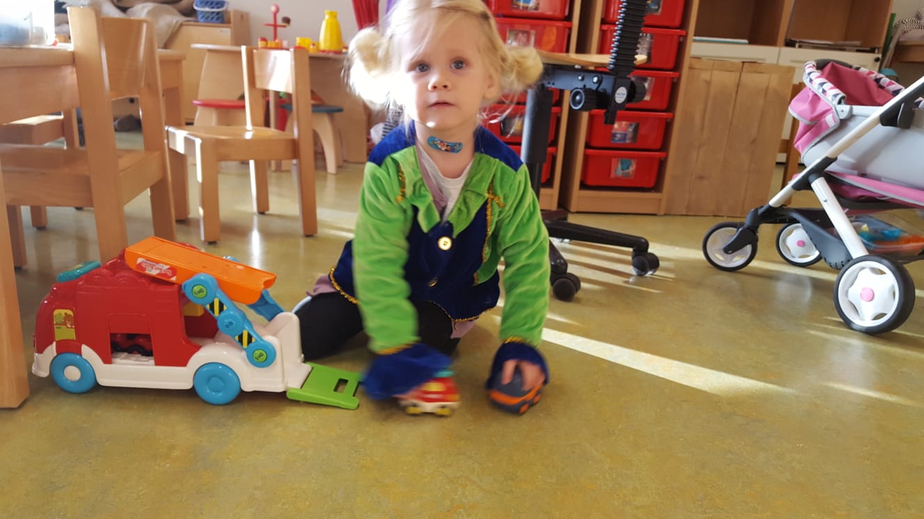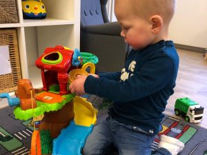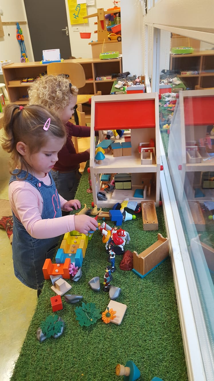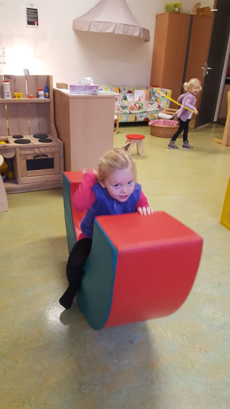 Wat is er toch veel te ontdekken op zo’n nieuwe groep; ander speelgoed, een andere huishoek met een hanglampje er boven en een grote witte kast waar spelletjes uit gekozen kunnen worden. Twee relax stoelen waarin boekjes gelezen kunnen worden, maar ook rustig een fles gegeven kan worden.