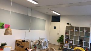 Met de grondbox voor de allerkleinste is er veel interactie tussen de kinderen onderling. Aan de wand hangt een grote spiegel, waarin de kinderen zichzelf ontdekken en vol verwondering naar zichzelf kijken. De grote tafel centraal op de groep biedt rust voor een spelletje, knutsel werkje en de gezamenlijke eetmomenten. In de hoge wipstoelen kunnen ook de kleinste kinderen hierbij zitten. De laminaat vloer maakt het plaatje helemaal af!