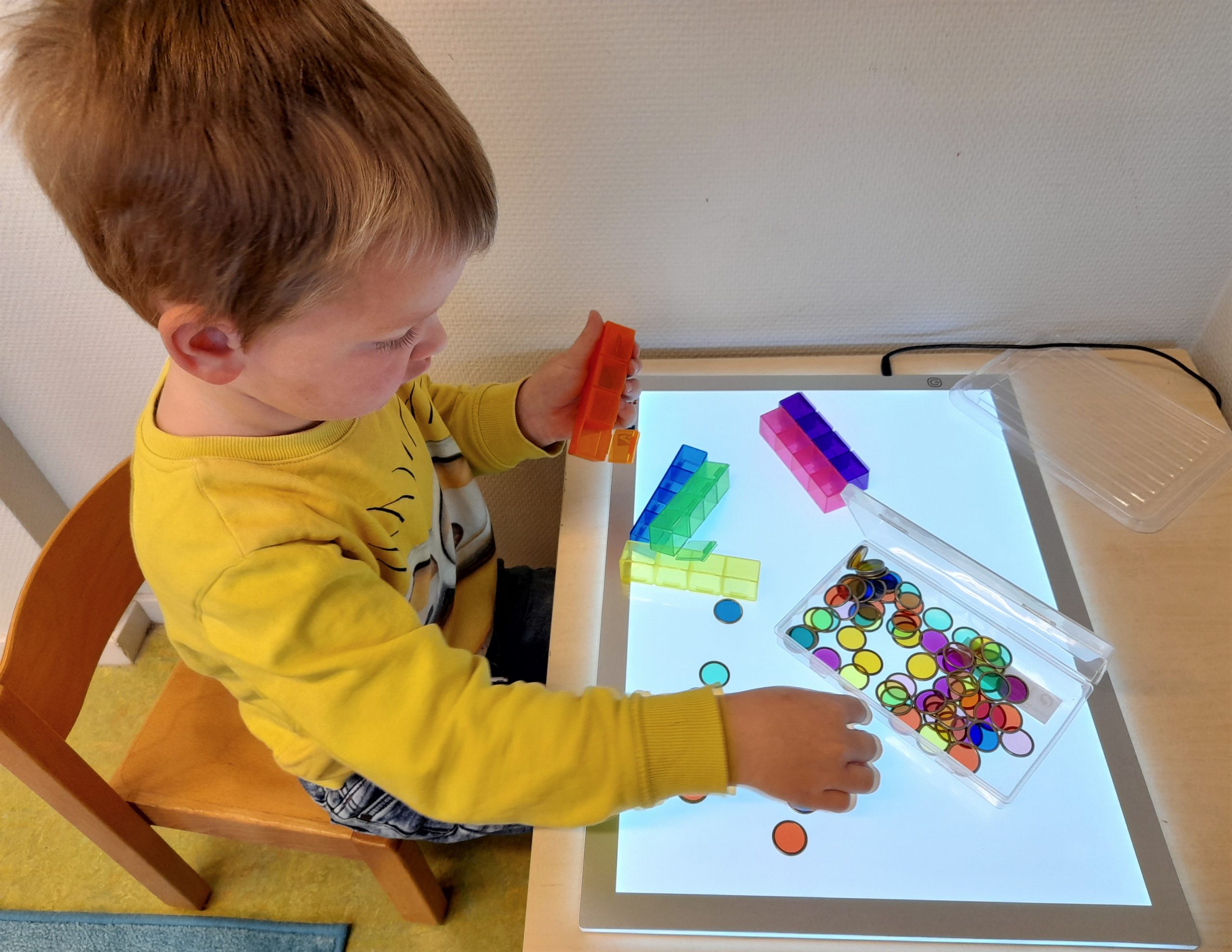 Op de lichtbak hebben we gekleurde magnetische rondjes. Dit zijn “pilletjes”. De pilletjes kunnen in de gekleurde medicijndoosjes gestopt worden. Lukt het ze de “pilletjes” in het doosje met dezelfde kleur te stoppen? En hoeveel zijn dat er dan? We gaan ze tellen!