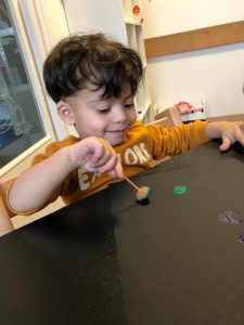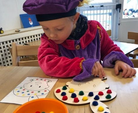 Er was ook nog een leuk spelletje, kinderen mochten met een pietenplankje verschillende kleuren pomponnetjes in de gaten stoppen. Zo leerden zij gelijk enkele kleuren. En natuurlijk mocht de schoen gezet worden en wat waren de kinderen blij en verrast dat er een cadeau lag bij hun schoen of laars.