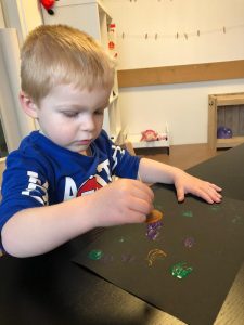 Er was ook nog een leuk spelletje, kinderen mochten met een pietenplankje verschillende kleuren pomponnetjes in de gaten stoppen. Zo leerden zij gelijk enkele kleuren. En natuurlijk mocht de schoen gezet worden en wat waren de kinderen blij en verrast dat er een cadeau lag bij hun schoen of laars.