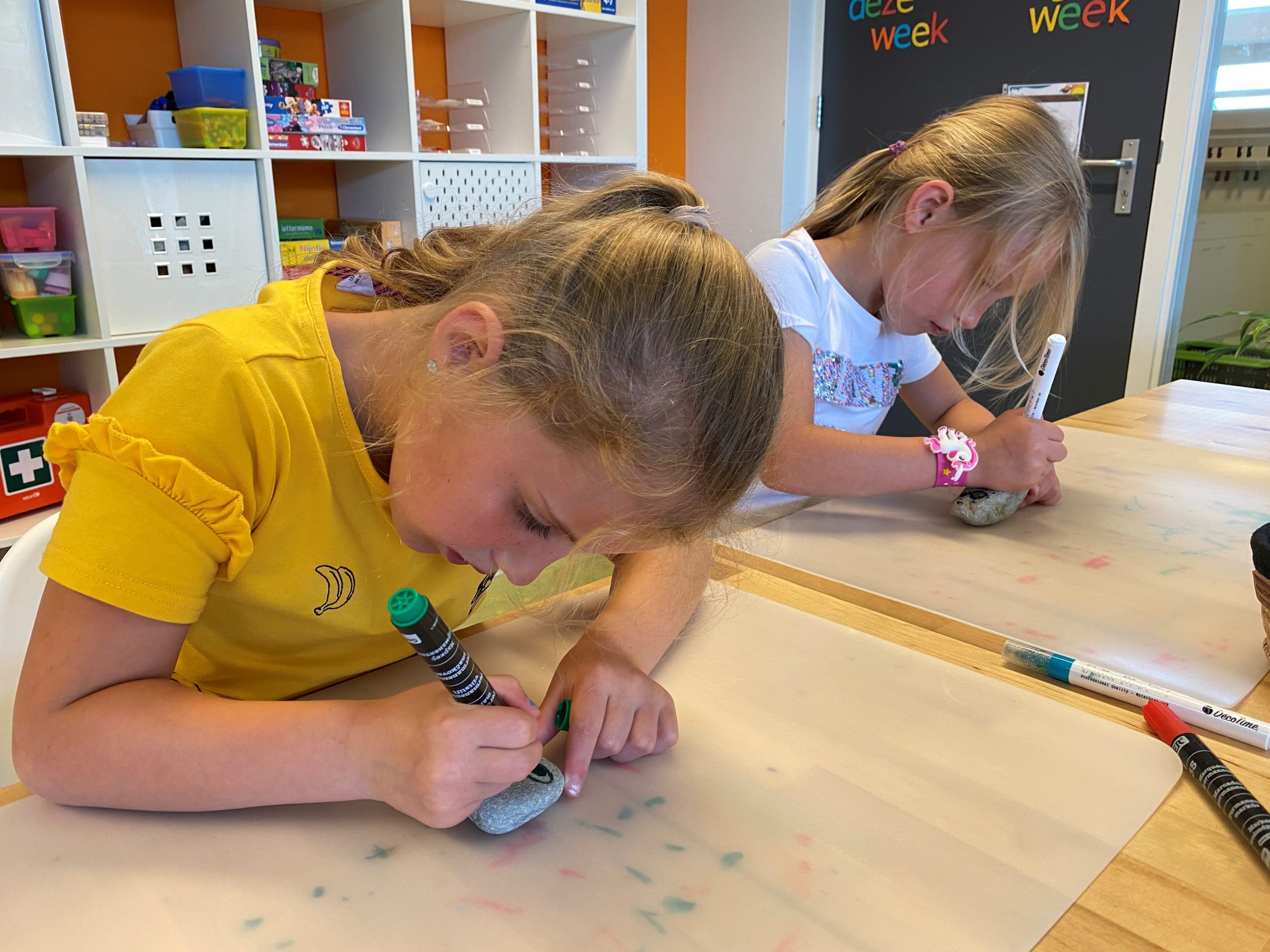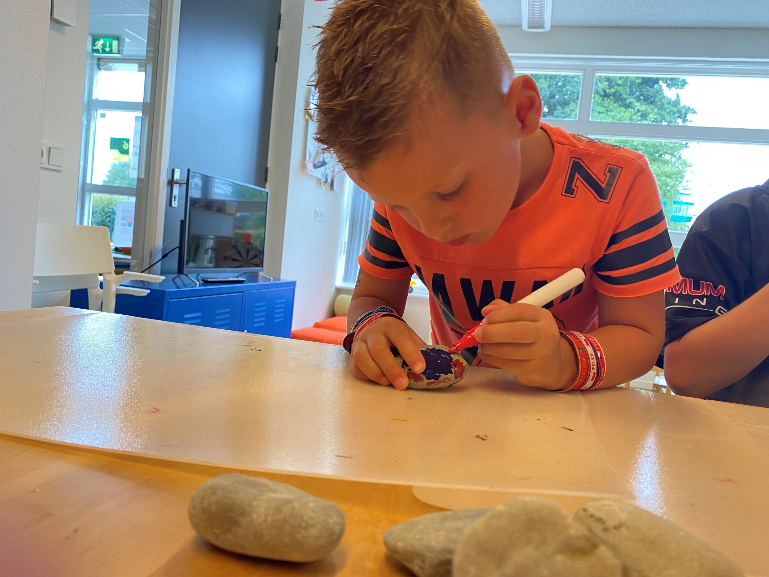 Dit bracht de kinderen op een idee…. wat als wij nou ook happy stones en deze gaan verstoppen. Alle kinderen zijn dan ook druk geweest met het versieren van een steen! Buiten op het schoolplein wordt hier een spelletje mee bedacht. Een van de kinderen gaat de stenen verstoppen en de andere kinderen gaan de stenen weer zoeken. Wie kan er de meeste stenen vinden?