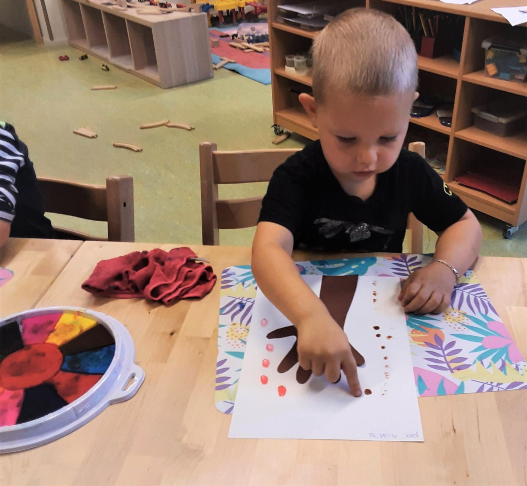 We maken ons eigen herfstbos. De hand en arm van de peuter is de stam met takken. Hun hand mogen ze met de vingers zo wijd en zo stil mogelijk op het papier laten liggen, zodat wij deze kunnen overtrekken. Dit is voor de allerkleinsten nog best een uitdaging. Met hun vinger stempelen ze daarna de vallende blaadjes. Steeds kiezen ze een andere kleur. Dus eerst de vinger afvegen en dan pas de volgende kleur inkt. Allemaal zijn ze geconcentreerd bezig.