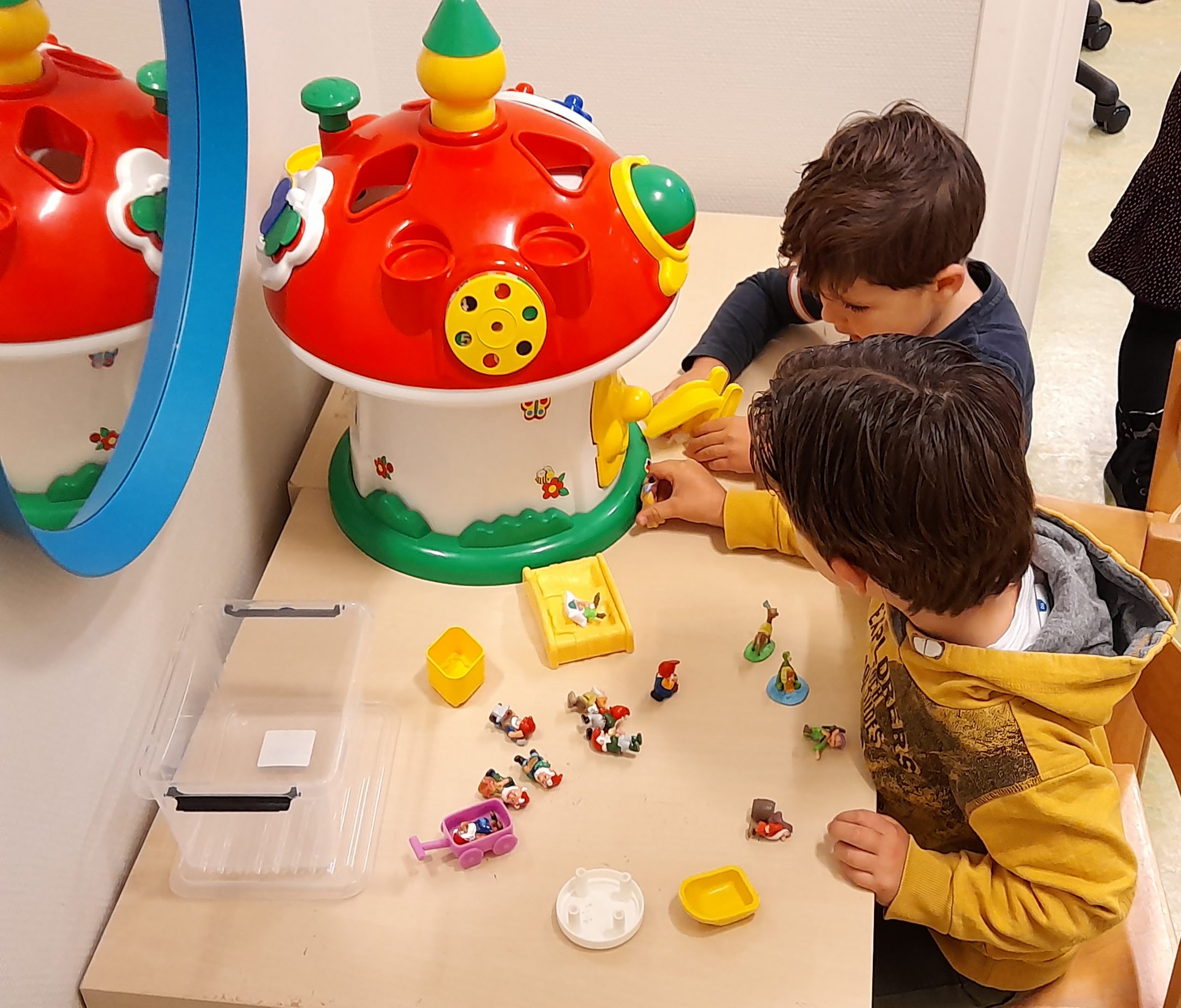 Ook de grote paddenstoel heeft een plek gekregen, met natuurlijk de kabouters erbij. Er wordt rollenspel gespeeld en veel gepraat wat de kabouters allemaal gaan doen. Zo kunnen ze slapen in het bed, aan de tafel zitten en zelfs van een glijbaan af. Of door openingen in het dak van de paddenstoel, maar dan moeten de peuters eerst wel goed draaien. Wat een pret als de kabouter dan in de paddenstoel valt.