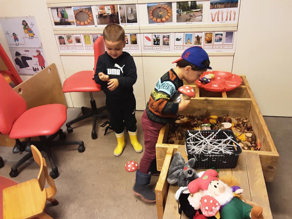 In de ontdekhoek liggen kastanjes, blaadjes, dennenappels en zelfs kabouters.
