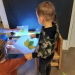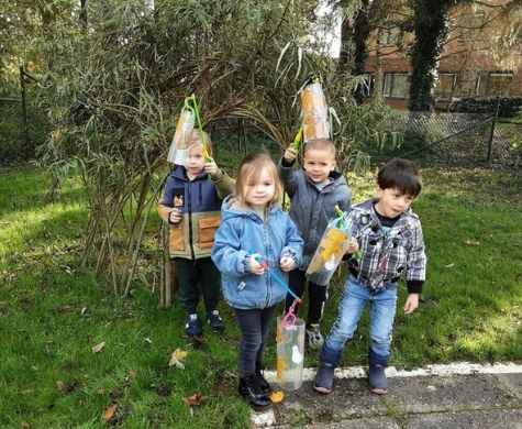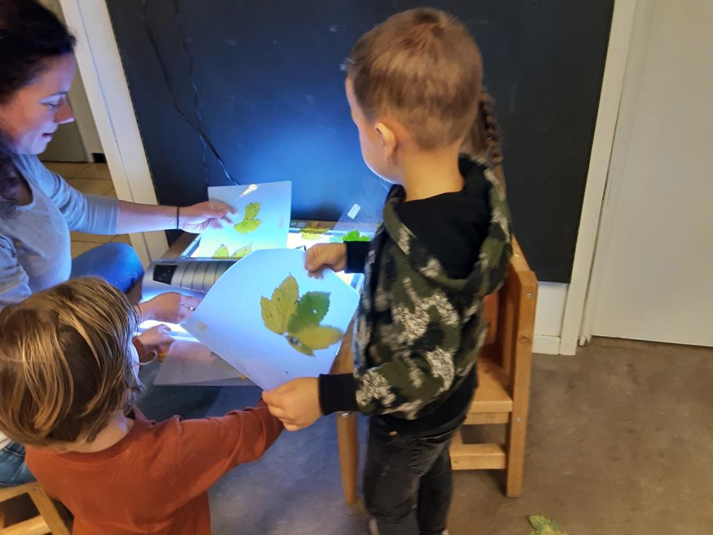 Van de gevonden herfstschatten maken we een herfstbakje, waar de zelfgemaakte egel mooi in past. En voor Sint Maarten maken we lampionnen van gelamineerde bladeren. Die bekijken we eerst op de lichttafel, wat een mooie kleuren!