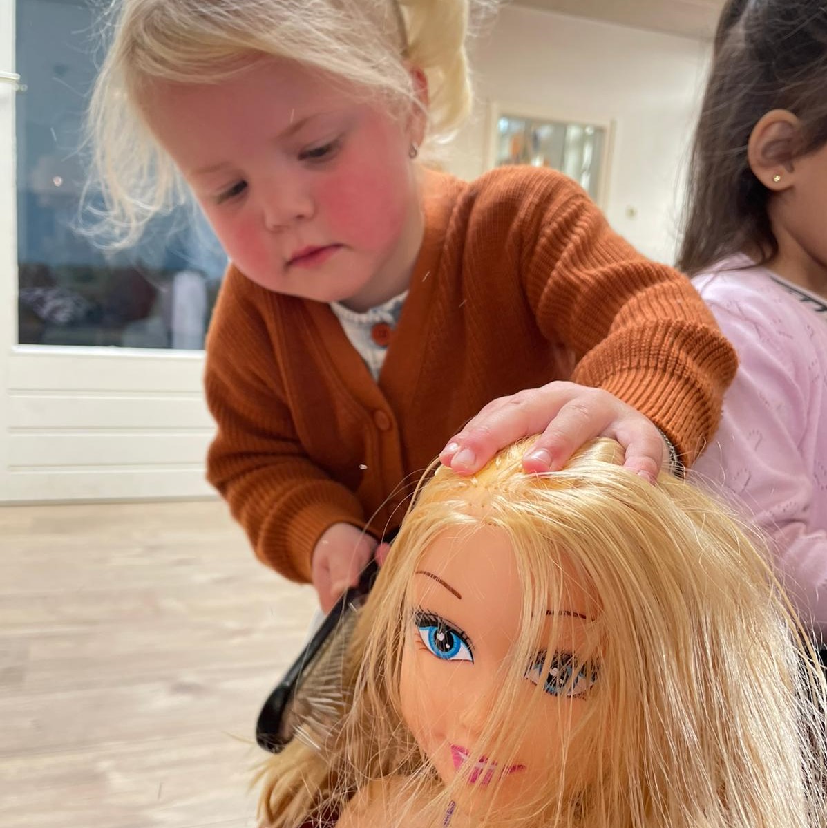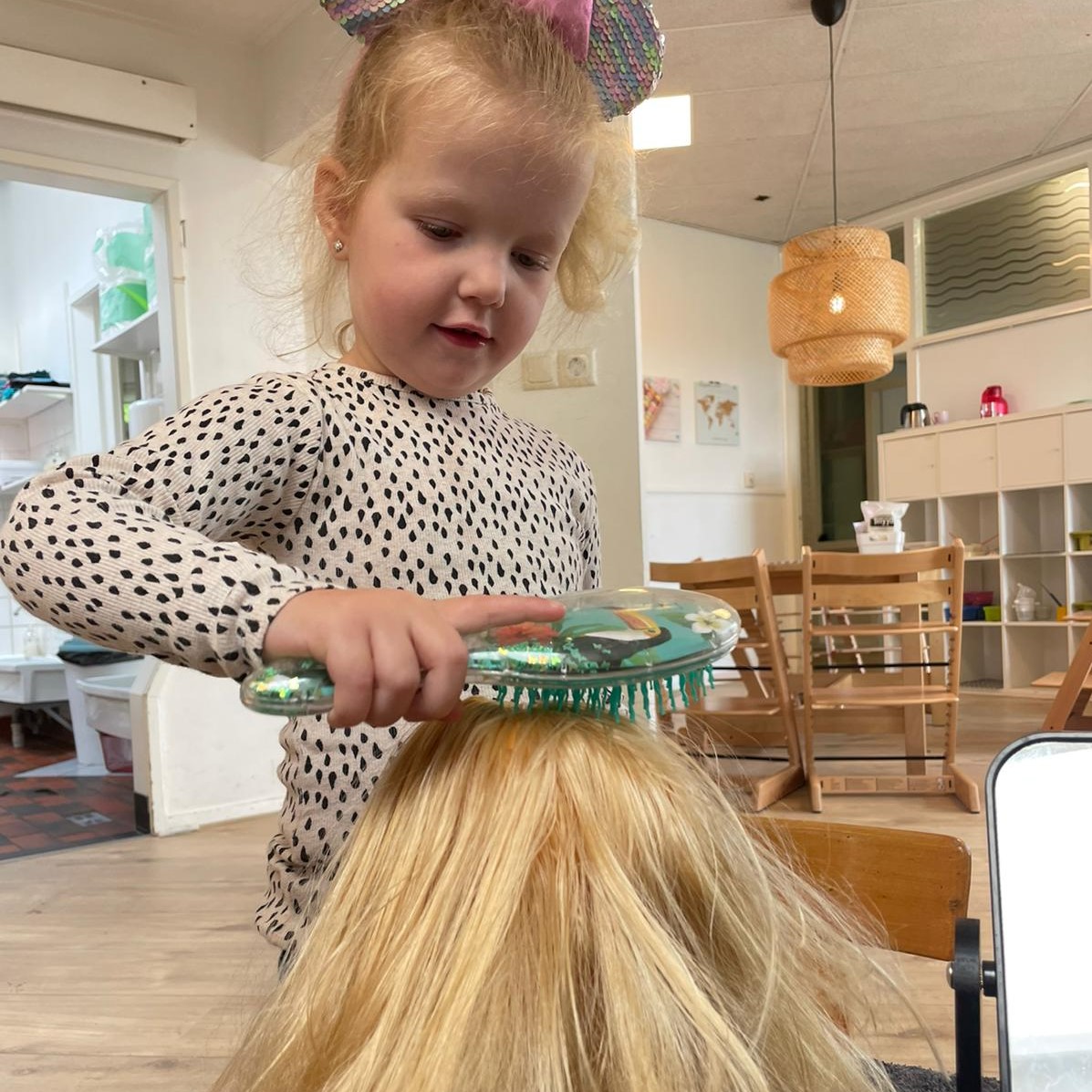 Op de groep staan kappers poppen waarbij de peuters haren kunnen kammen, fohnen, knippen en stylen. Ook hebben we haren geplakt op de pop, en doen we een tel spelletje in de kring. De laatste week mogen de kinderen zelf bij de pedagogisch medewerkers hun haren laten doen! Een mooie vlecht, staart, gel of een knipje er in, het kan allemaal! Maar het allerleukste is toch wel een kleurtje in je haar!