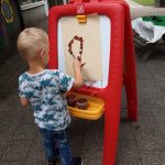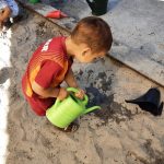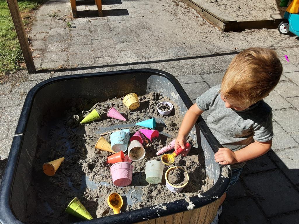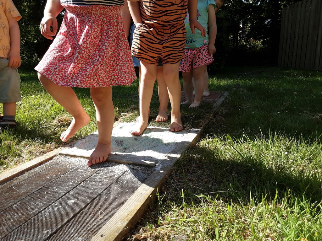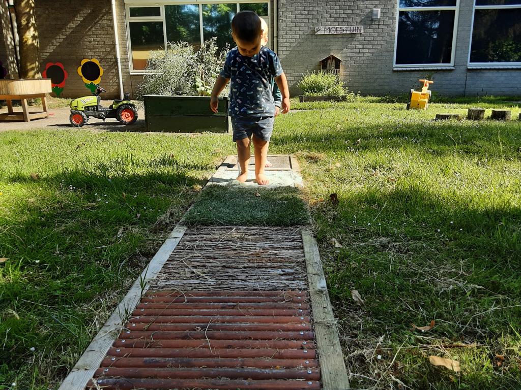 Een andere activiteit was het ervaren van verschillende ondergronden op het blote voetenpad, waaronder zand. Alles voelt anders onder je voeten; hard of zacht, koud of warm, kriebelig. Een hele ervaring voor de peuters.