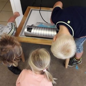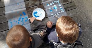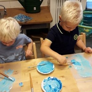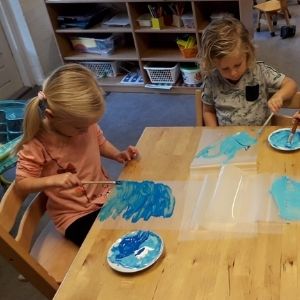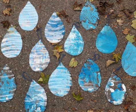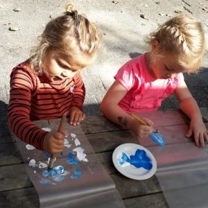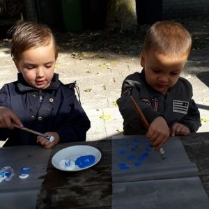 De activiteit ‘maak je eigen waterdruppel’ maakt de peuters erg enthousiast. Eerst lekker verven (binnen, maar ook buiten), dan meehelpen met lamineren en daarna knippen we er een waterdruppel van. We hangen ze gezellig bij elkaar op onze groep. Wat zijn ze leuk geworden!