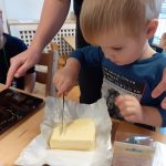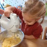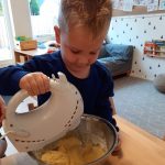 Eerst allemaal onze handen wassen en daarna snel aan tafel. Even lezen wat we nodig hebben…. eieren, cake mix en een beetje boter. Eerst deden we de cake mix in de kom, daarna gingen we de boter wegen en ook in de kom doen, toen nog de eieren en daarna allemaal even mixen. Toen was het beslag klaar en gingen we de cupcake vormpjes vullen, even in de oven, versieren en lekker smullen in de kring!