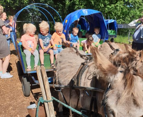 Daarna werd het pas echt spannend. De ezels Bas, Bart en Daniël werden ingespannen voor de huifkar. De jongste peuters waren nog wat afwachtend maar al snel zat iedereen in de huifkar en hebben we een gezellige wandeling gemaakt met de ezels.