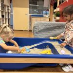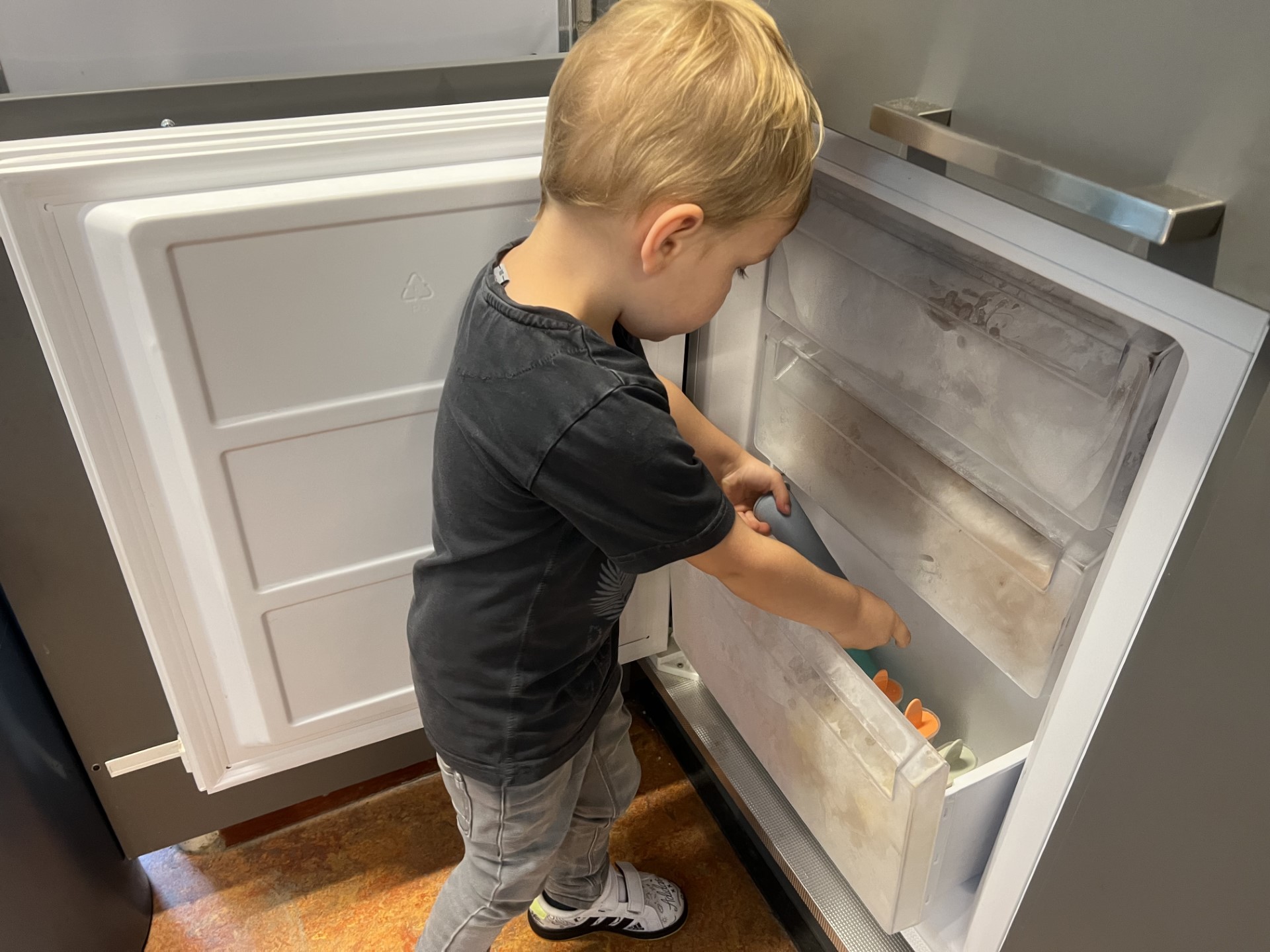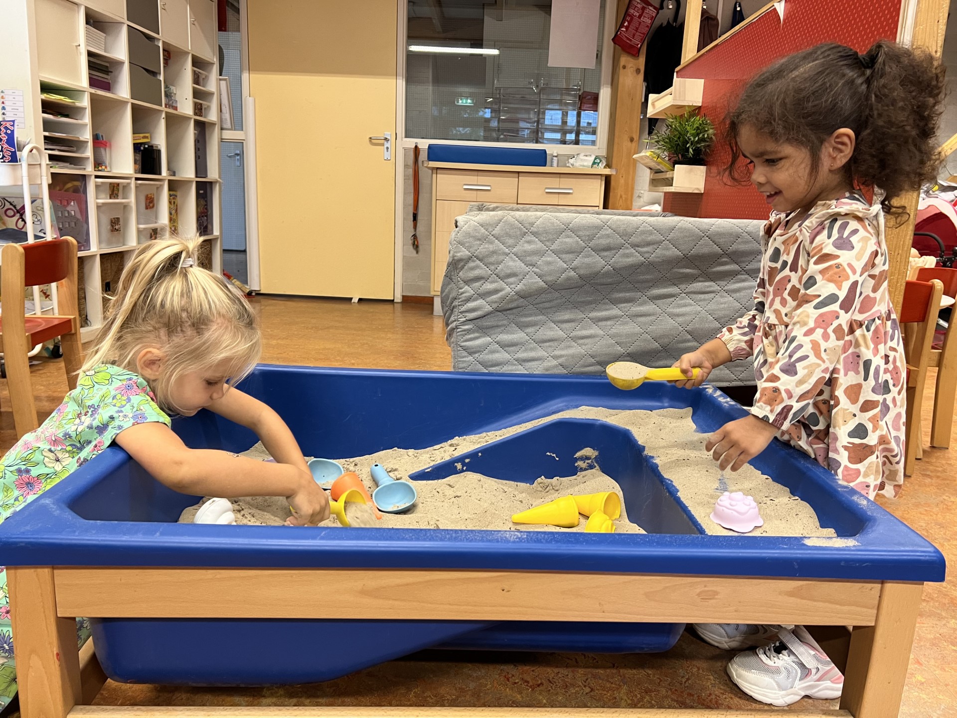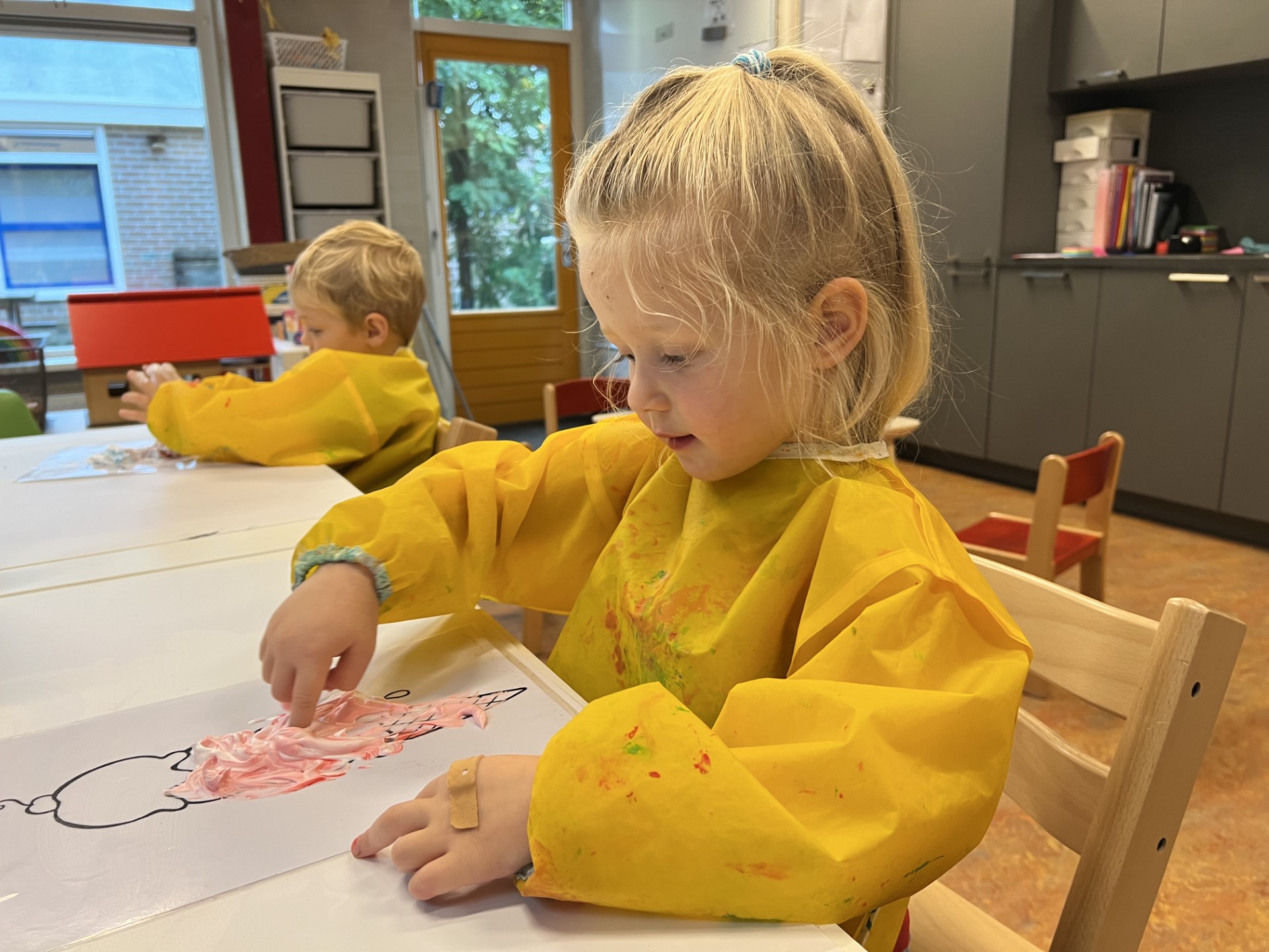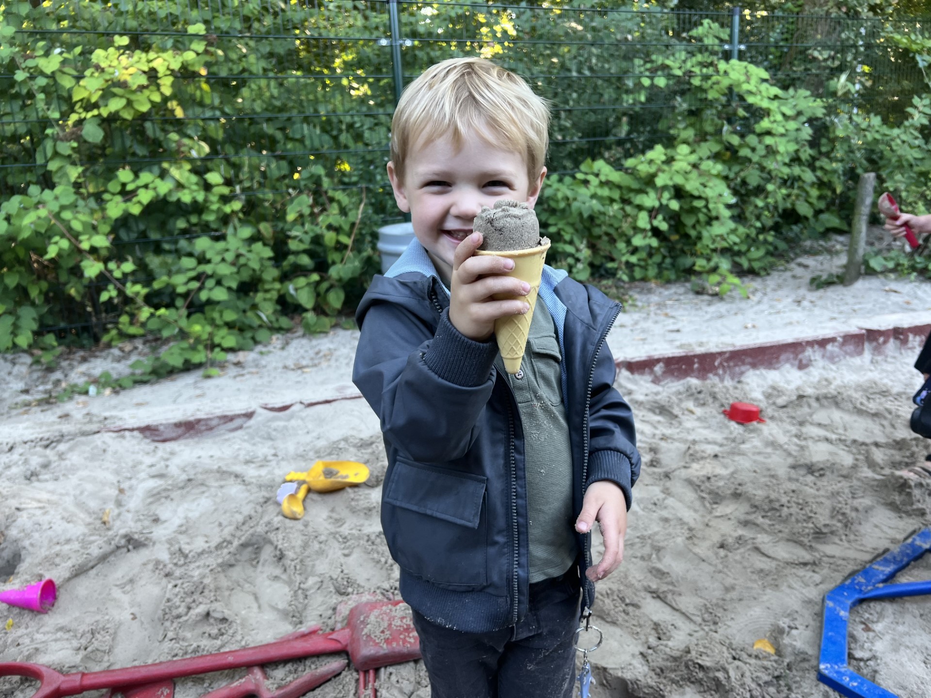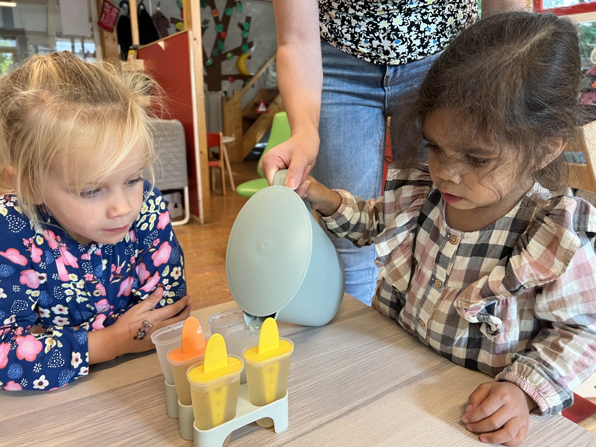 We hebben scheerschuim gemengd met verf en deden net of het ijs was en daarmee hebben de peuters ijs op papier versierd. Op de groep in de zandtafel en buiten in de zandbak worden er heerlijke ijsjes en taartjes gemaakt. Ook worden er zelf ijsjes gemaakt. De peuters gieten sap in ijsvormpjes en zetten deze daarna in de vriezer. Wat zal er met het sap gebeuren… ? Dat ontdekken de peuters de volgende dag!