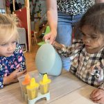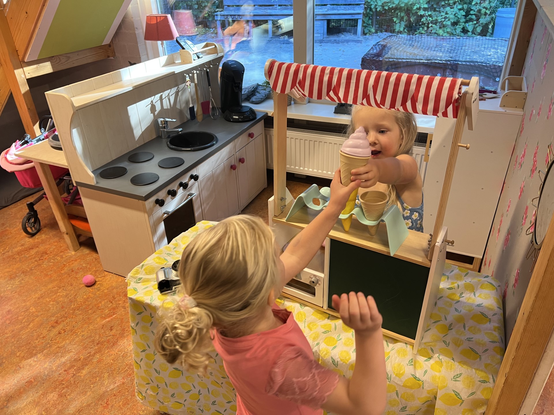De peuters van Kiddo’s hebben de afgelopen tijd aan het thema ‘’ Wij gaan naar de ijssalon’’ gewerkt. Het thema is geïntroduceerd door middel van een schattenmandje. Dit is een mandje met allemaal spullen die gebruikt worden in de ijssalon zoals servetjes, lepels, ijsbolletjes, ijshoorntjes en ijsbakjes. Tijdens de kring bespreken we wat je allemaal nodig hebt in de ijswinkel en waarvoor je alle materialen kan gebruiken.