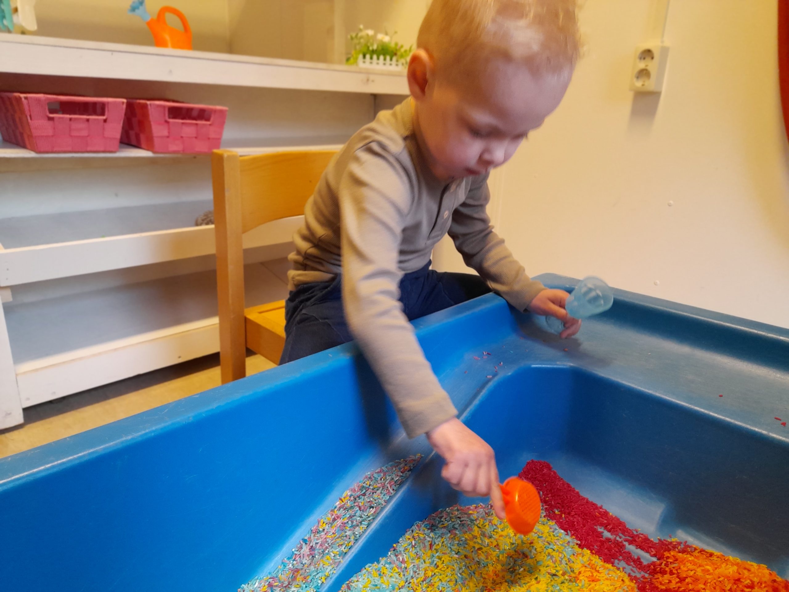 Wanneer de rijst droog is, doen we de zakjes 1 voor 1 in de zandwatertafel. Een mooie grote regenboog ontstaat. We oefenen nogmaals alle kleuren. Heel lang is de regenboog niet zichtbaar en ligt alle rijst door elkaar. Dan nog ziet het er mooi en uitdagend uit. Er wordt dan ook op allerlei verschillende manieren mee gespeeld. De een is druk met de stokjes en ijsschep om er ijsjes van te maken, terwijl de ander erg druk is met schenken en de trechter. De kleinere kinderen zijn vooral erg druk met grabbelen, graaien, pakken en terug doen.
