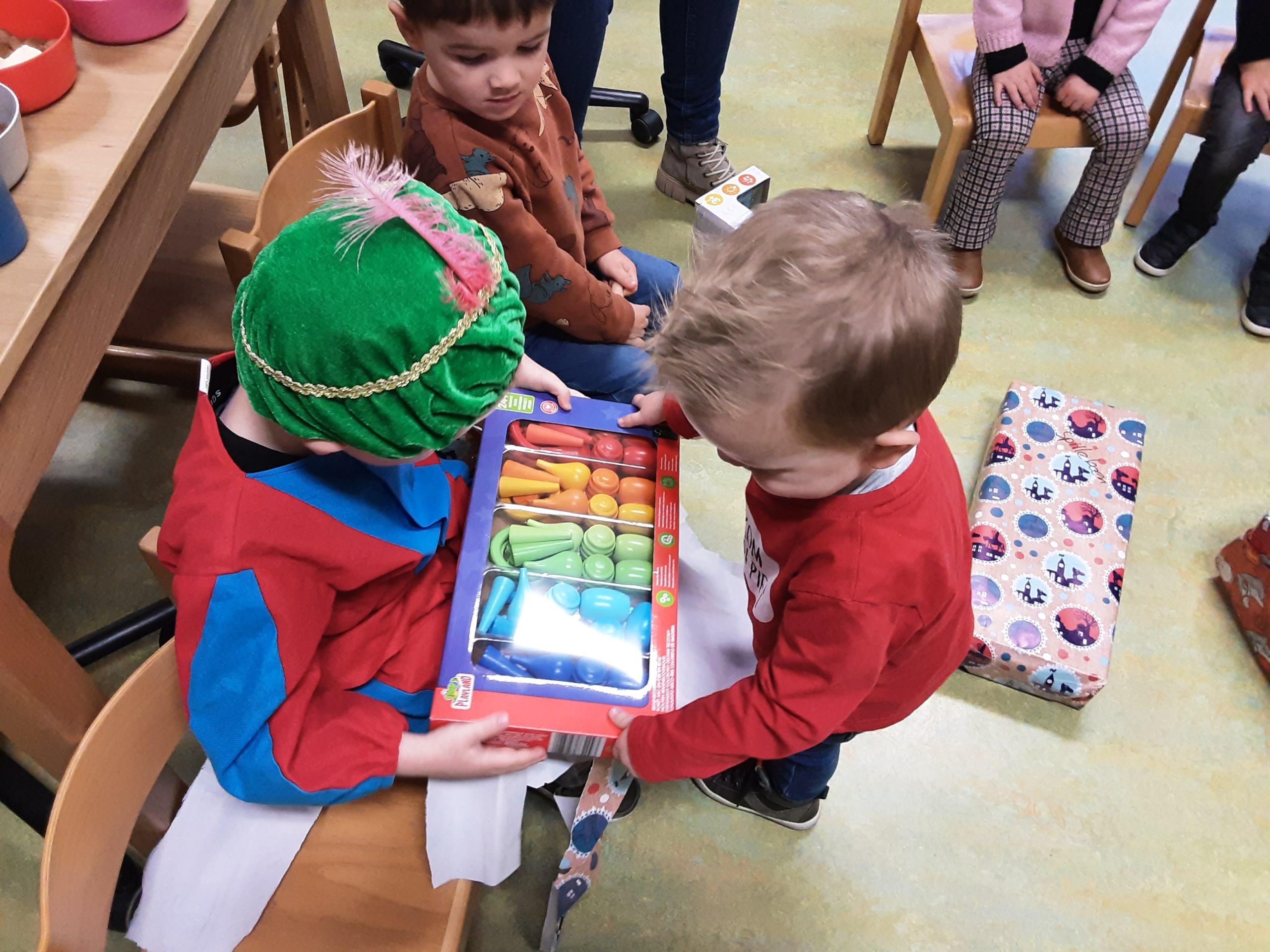 Bij terugkomst in het lokaal was er een grote verrassing want Sint had er een grote pietenzak neergelegd vol met cadeaus voor de peuters en ook voor op de groep om samen mee te spelen. Er kan weer terug gekeken worden op een geslaagd feest.