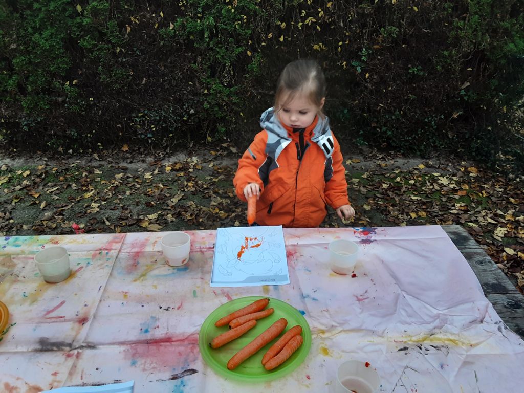 Ook werd er werd geverfd; niet met een kwast, maar met een wortel! De peuters konden zo met verf experimenteren.