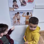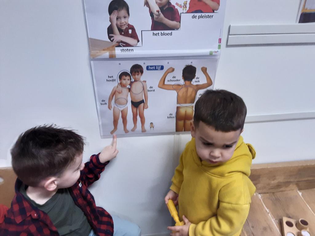 We lezen het boek ‘Karel in het ziekenhuis’ en spelen het na. De woordkaarten hebben te maken met gezondheid en ziekte, maar ook bijvoorbeeld de lichaamsdelen en emoties komen aan bod.