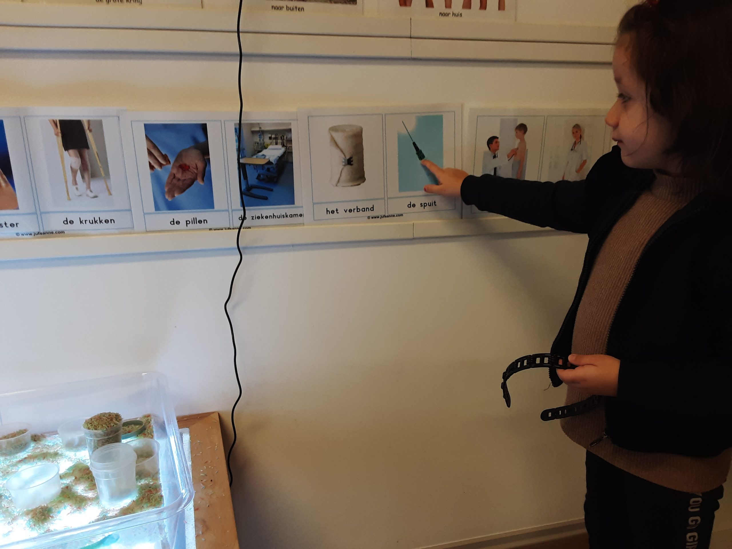 Op de lichttafel kunnen de peuters medicijnpotjes vullen met ‘pilletjes’ (gekleurde rijst). Hier zijn ze heel druk mee! Spelen met gekleurde rijst is een zintuiglijke activiteit die de beleving stimuleert met kijken, voelen, horen en fantasievol spelen.